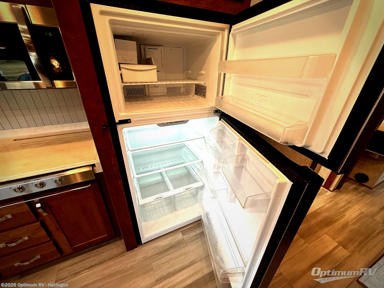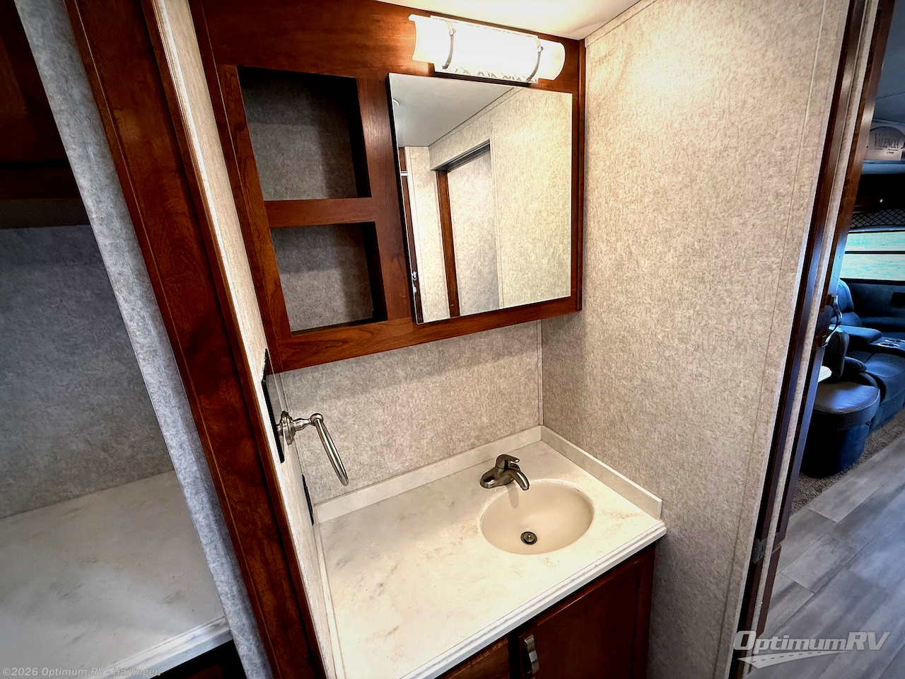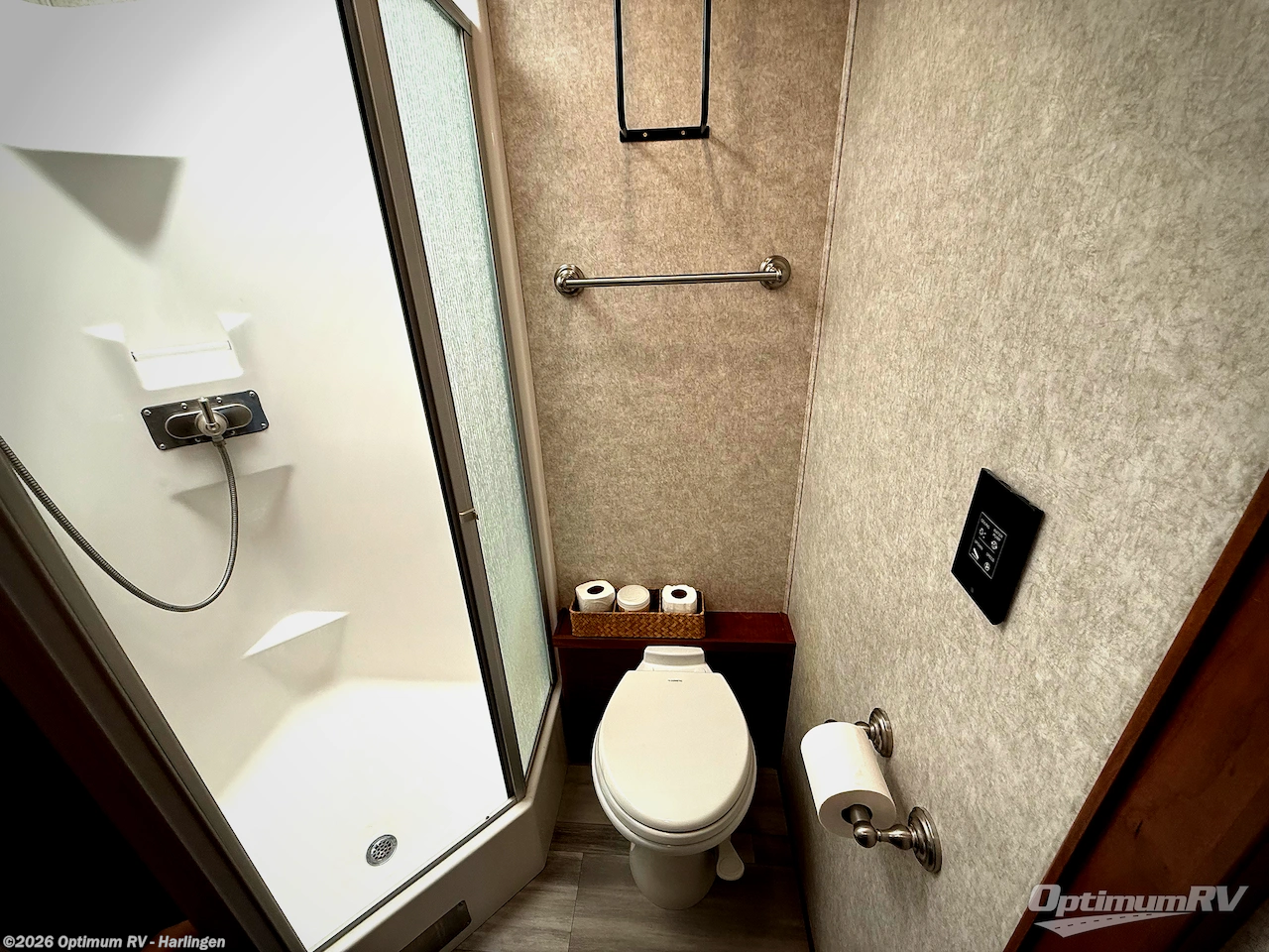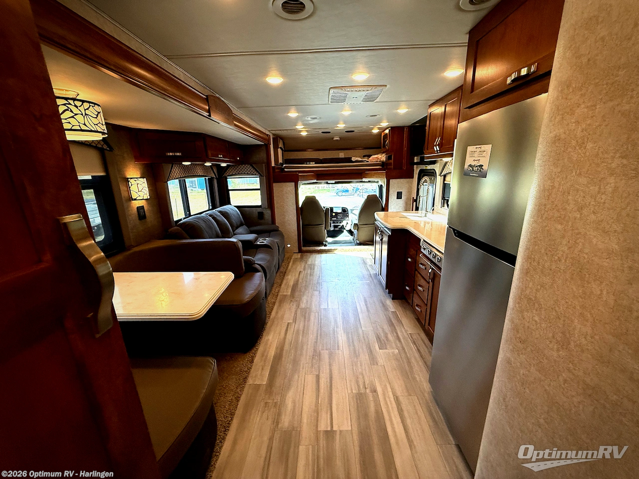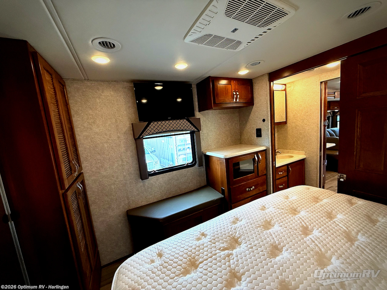 Enjoy a home on wheels with this motorhome! Start your mornings feeling refreshed and ready to go after sleeping on the 72" x 74" king bed and showering in the neo-angled shower with a skylight above and a vent to eliminate steam in the walk-through bathroom. The bedroom also has a 32" TV with a cedar chest, a dresser with overhead cabinets, a large wardrobe, and an area prepped to add an optional washer and dryer. You can prepare your best meals with the three burner cooktop and 19 cu. ft. refrigerator and enjoy them at the booth dinette. The hide-a-bed sofa and 60" x 80" bunk over cab offer comfortable sleeping spaces for extra guests too!