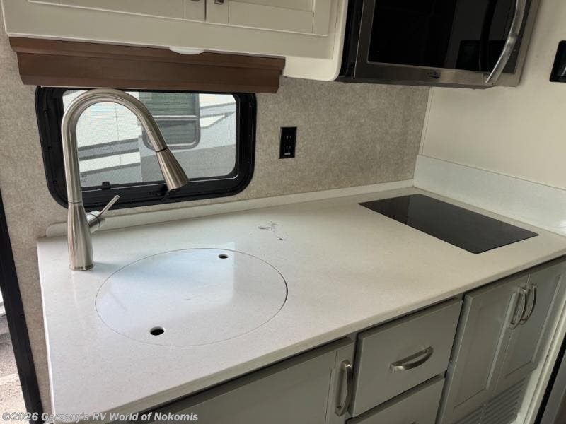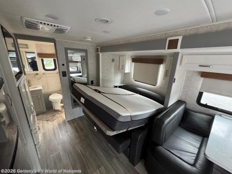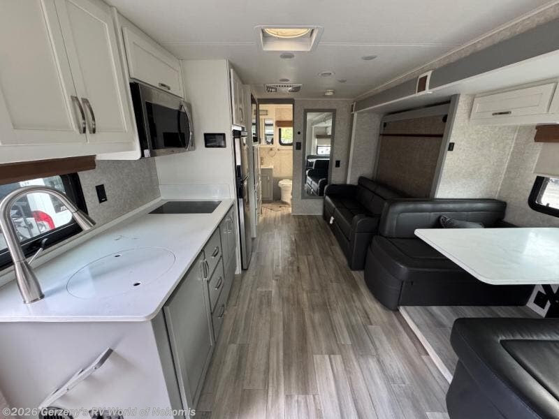 Travel the countryside with the ones you love in this motorhome! It features a full rear bathroom with a 30" x 36" shower to freshen up in each morning and a 20" x 42" wardrobe to keep your linens close. There is versatility when it comes to sleeping spaces between the Murphy bed with a 66" x 72" mattress to sleep on and a jiffy sofa to sit on during the day, the 70" dinette, and the 46" x 80" bunk over cab. The kitchen has been beautifully redesigned with solid hardwood cabinets, solid surface countertops, extra space provided by the bed and dinette slide, and storage above the sink, as well as storage behind the 40" TV, a pantry, and a 10 cu. ft. refrigerator to keep your perishables fresh!