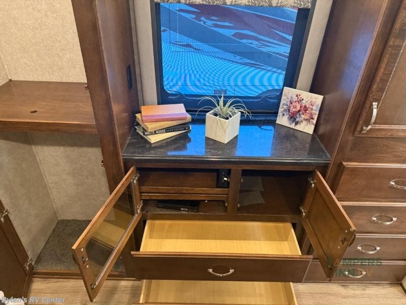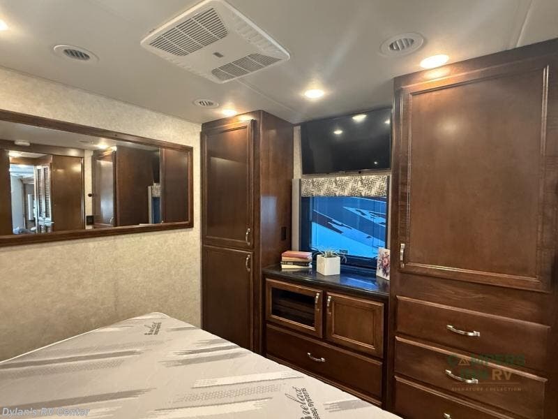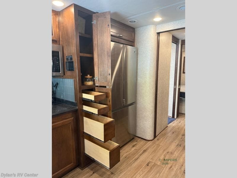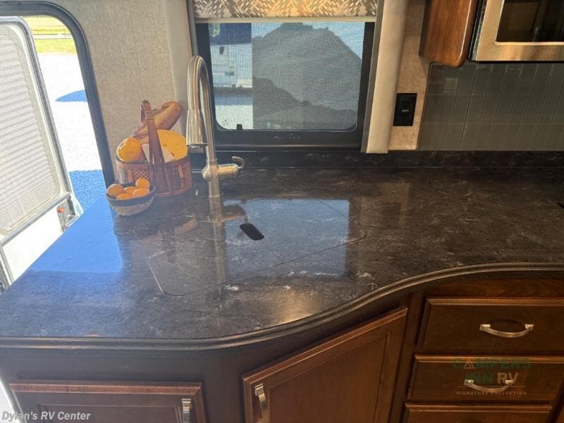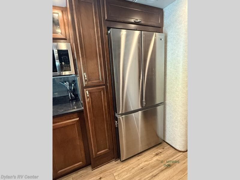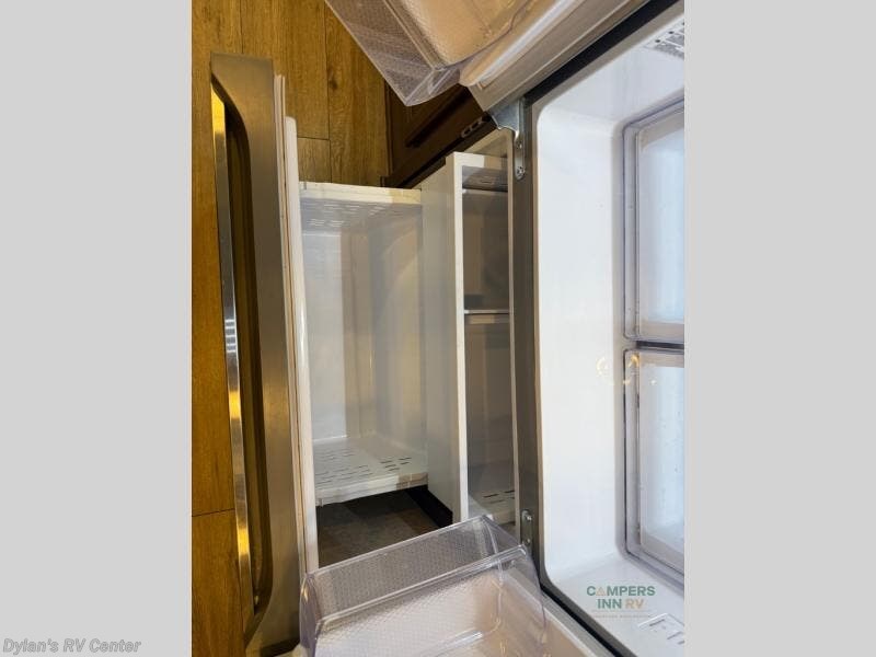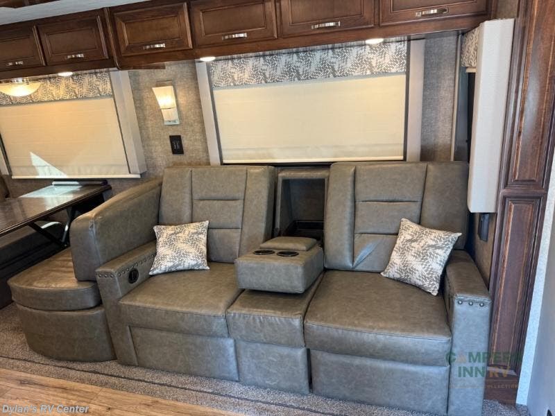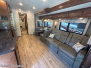 Renegade Verona Super C diesel motorhome 36VSB highlights: RV King Bed Shower Skylight Slide-A-Bed Sofa 43" 4K Smart LED TV Outside Entertainment Whether you travel while you work or enjoy long-trips in your RV, this coach provides all the luxury, flexibility and comfort you could want! The main living and kitchen area is spacious with a furniture slide which includes a booth dinette and a slide-a-bed sofa which both offer sleeping space when needed for guests. The cook will love using the stainless-steel convection microwave oven and the induction cooktop when making meals, and the French door residential refrigerator will hold lots of cold food. The separated bathroom allows two people to get ready at once, and the king bed slide gives you more floor space in the bedroom to get to the closets and dresser. You will find a 32" 4K Smart LED TV in the bedroom to watch before bedtime, and the exterior offers a 32" LED TV to watch the big game while relaxing under the electric awning with LED lights. And you might like to add the washer/dryer option to the prepped closet to keep everything clean while on the road. With any Renegade Verona Super C diesel motorhome, you will have confidence to explore the open road! The Cummins 360HP 3200TRV Allison transmission gives you the power and performance to travel anywhere, and the 3000-watt Magnum Hybrid inverter makes this an electric coach, plus the four-point automatic hydraulic leveling system allows for easy setup. The interior boast about the solid hardwood cabinets including every cabinet stile and passage door are made from hardwood for true residential craftsmanship and the articulating cabinet hinges complete the package. More luxurious features include the polished solid surface countertops, the iRelax memory foam mattress, the full-length wardrobe with a removable shelf and shoe storage, and the color coordinated fiberglass shower with glass door. Choose extreme luxury, purpose and durability, take a Verona on the road today!