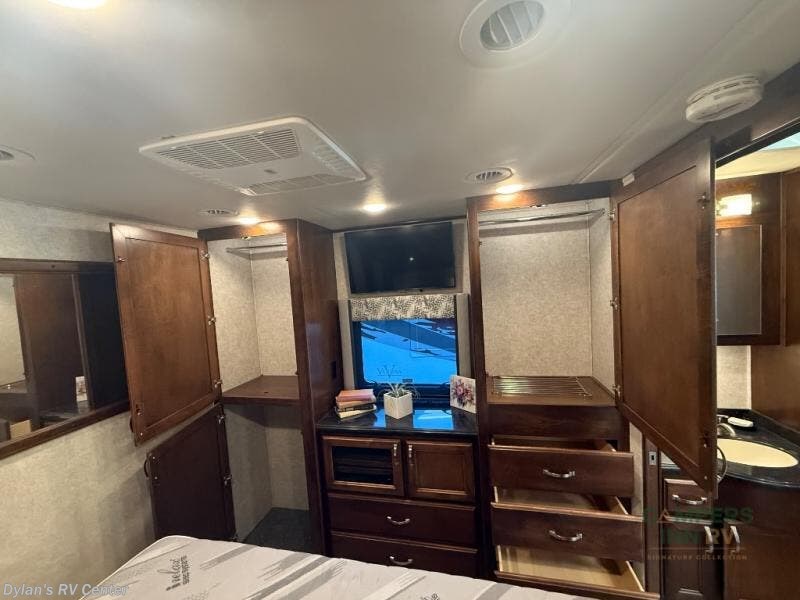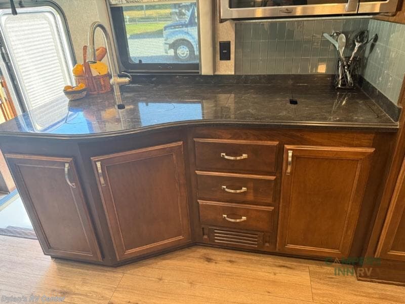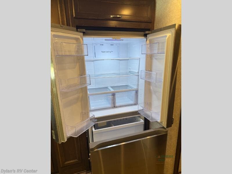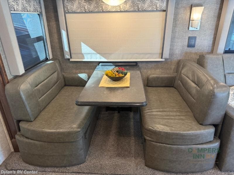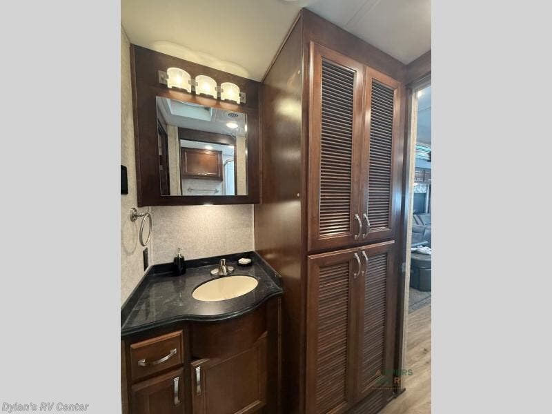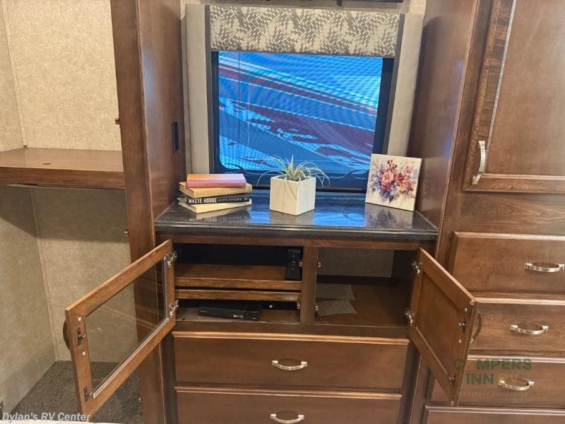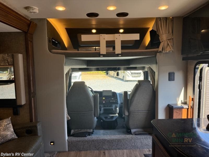 Renegade Verona Super C diesel motorhome 36VSB highlights: RV King Bed Shower Skylight Slide-A-Bed Sofa 43" 4K Smart LED TV Outside Entertainment Whether you travel while you work or enjoy long-trips in your RV, this coach provides all the luxury, flexibility and comfort you could want! The main living and kitchen area is spacious with a furniture slide which includes a booth dinette and a slide-a-bed sofa which both offer sleeping space when needed for guests. The cook will love using the stainless-steel convection microwave oven and the induction cooktop when making meals, and the French door residential refrigerator will hold lots of cold food. The separated bathroom allows two people to get ready at once, and the king bed slide gives you more floor space in the bedroom to get to the closets and dresser. You will find a 32" 4K Smart LED TV in the bedroom to watch before bedtime, and the exterior offers a 32" LED TV to watch the big game while relaxing under the electric awning with LED lights. And you might like to add the washer/dryer option to the prepped closet to keep everything clean while on the road. With any Renegade Verona Super C diesel motorhome, you will have confidence to explore the open road! The Cummins 360HP 3200TRV Allison transmission gives you the power and performance to travel anywhere, and the 3000-watt Magnum Hybrid inverter makes this an electric coach, plus the four-point automatic hydraulic leveling system allows for easy setup. The interior boast about the solid hardwood cabinets including every cabinet stile and passage door are made from hardwood for true residential craftsmanship and the articulating cabinet hinges complete the package. More luxurious features include the polished solid surface countertops, the iRelax memory foam mattress, the full-length wardrobe with a removable shelf and shoe storage, and the color coordinated fiberglass shower with glass door. Choose extreme luxury, purpose and durability, take a Verona on the road today!