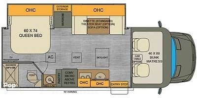 With a rear RV queen in the slide and a 46″ x 80″ cab-over bunk, it provides generous room for up to four. Very comfy stadium-style loveseat with massaging and a recliner.