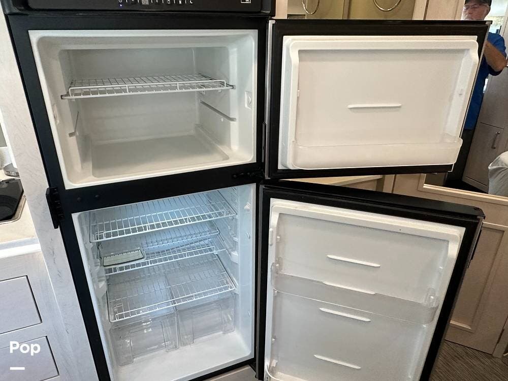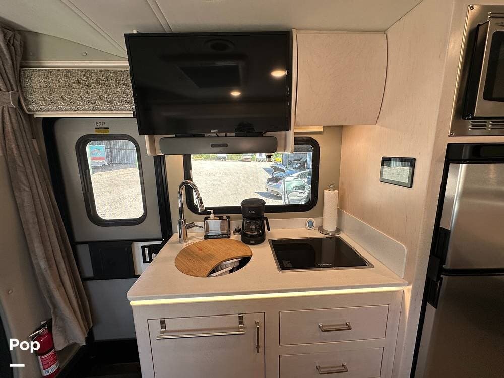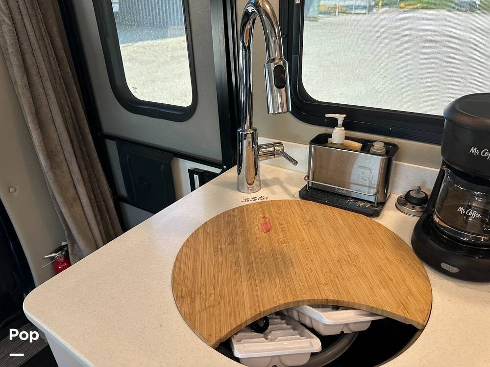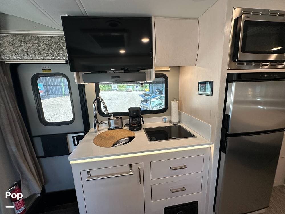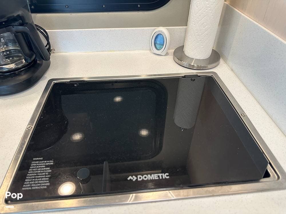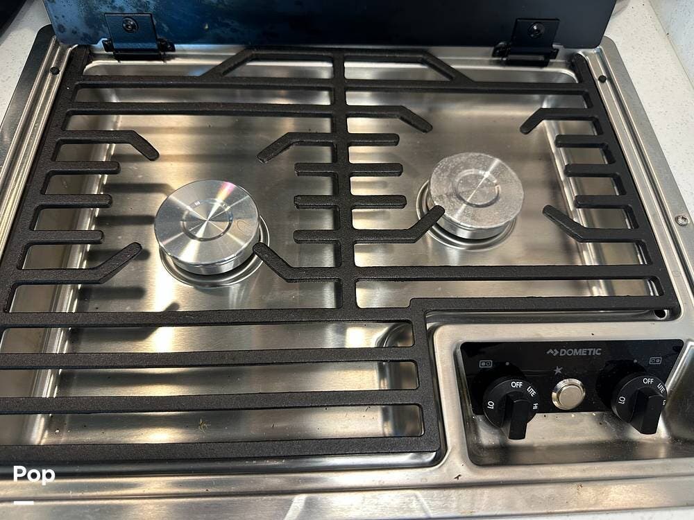 The kitchen features solid-surface counters with a flip-up extension, a two-burner cooktop, a convection microwave, and an 8 cu ft 12-V compressor fridge, serving everyday meals.