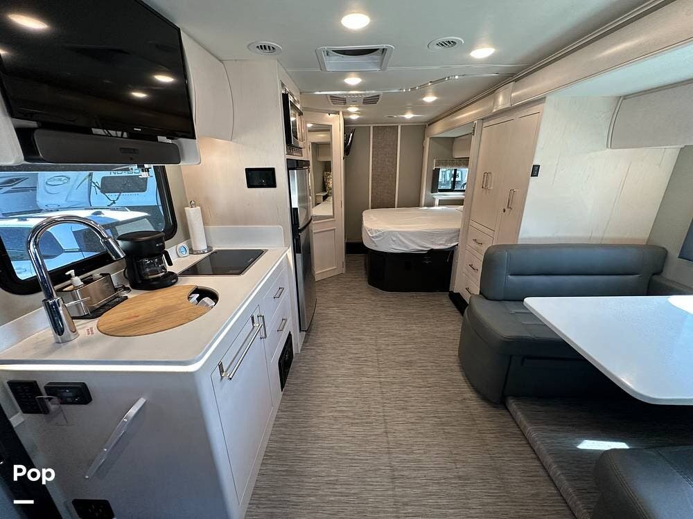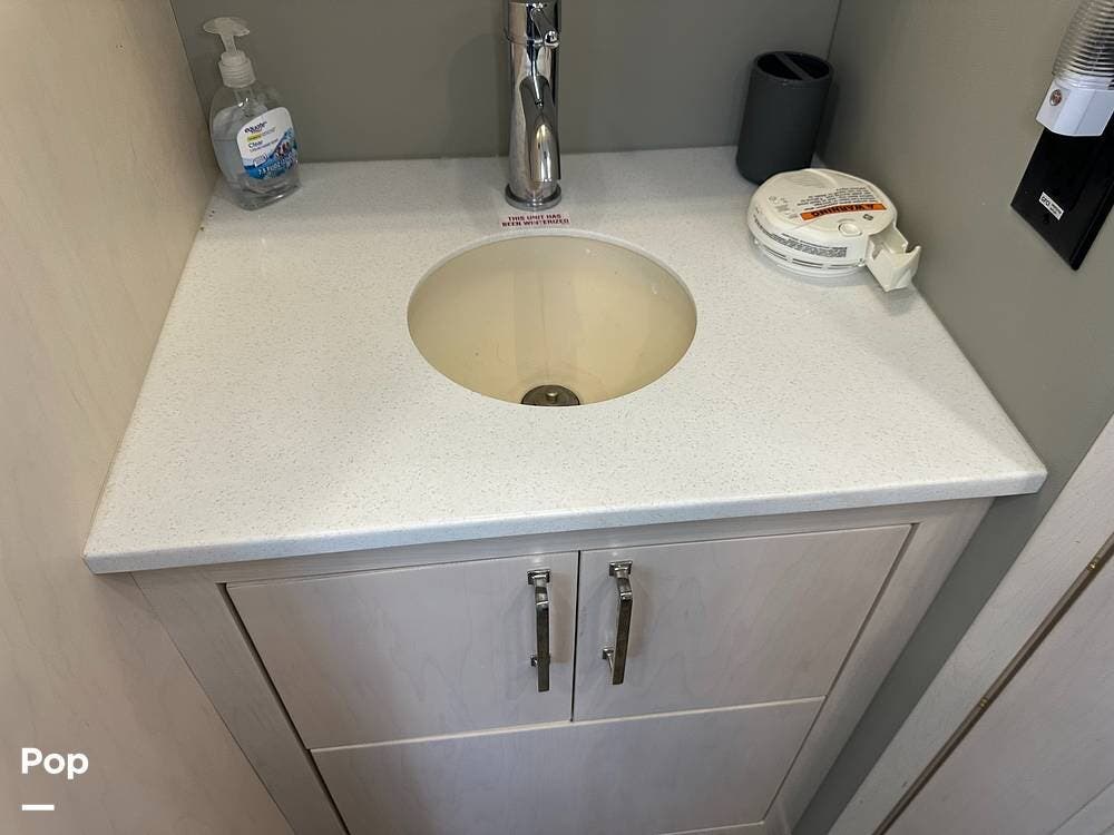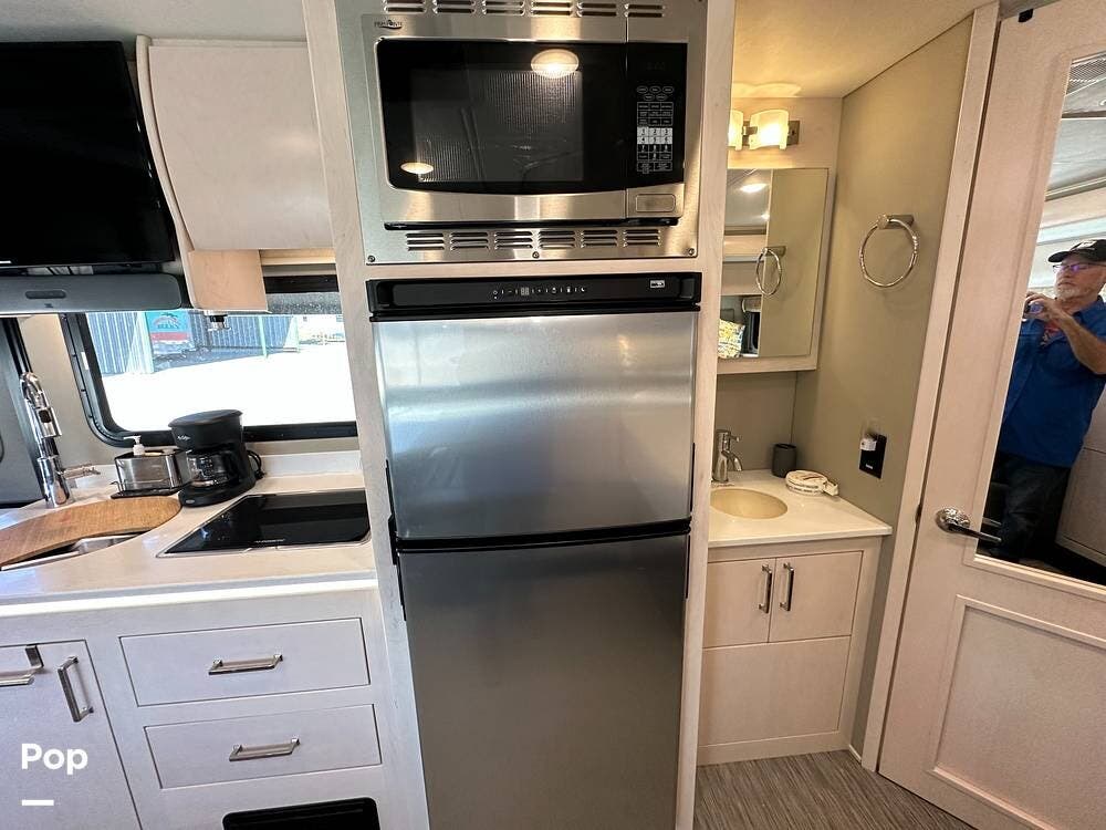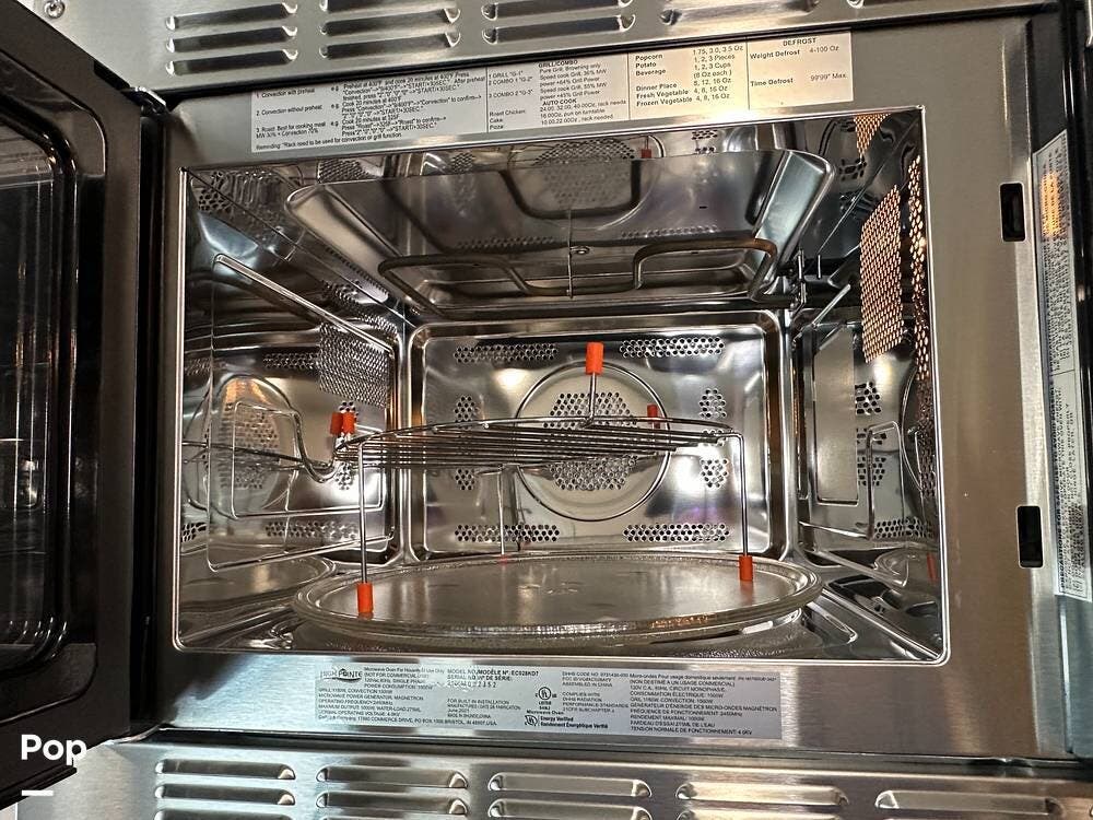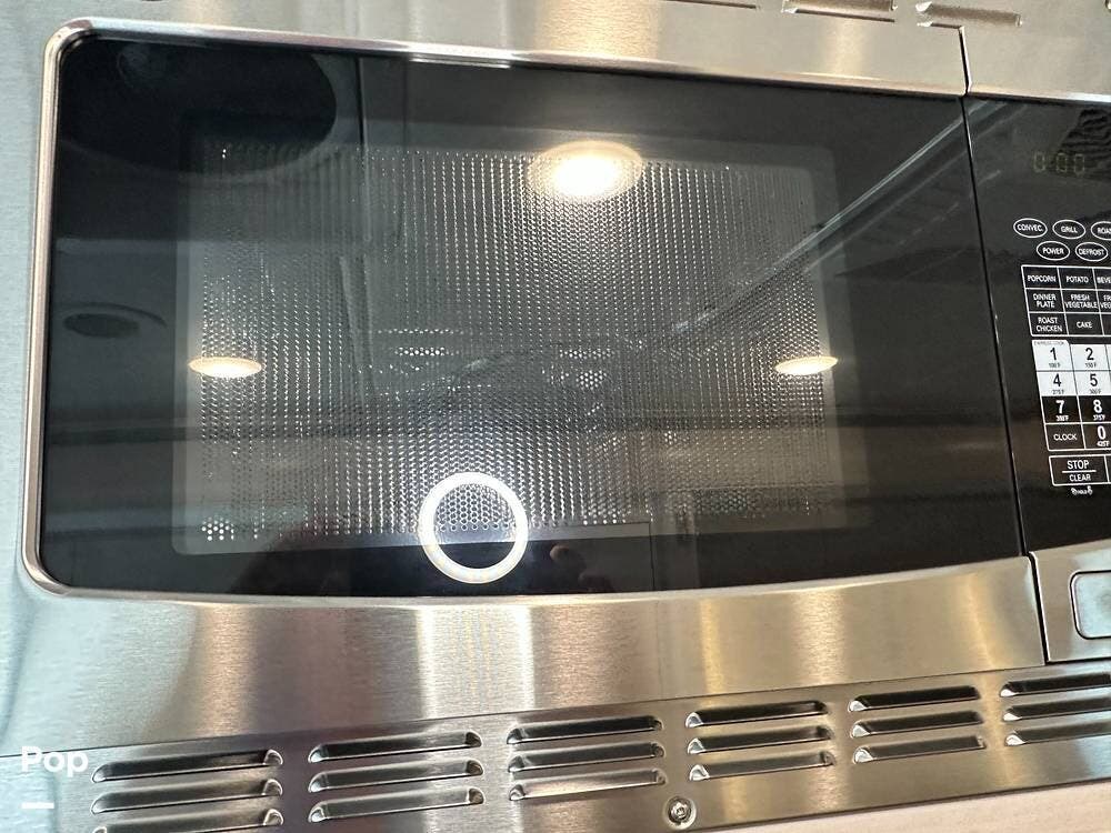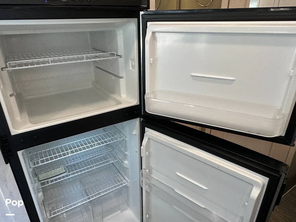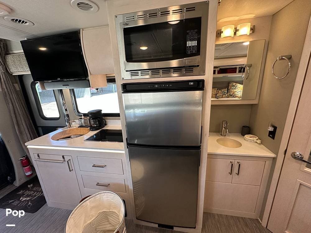 The kitchen features solid-surface counters with a flip-up extension, a two-burner cooktop, a convection microwave, and an 8 cu ft 12-V compressor fridge, serving everyday meals.