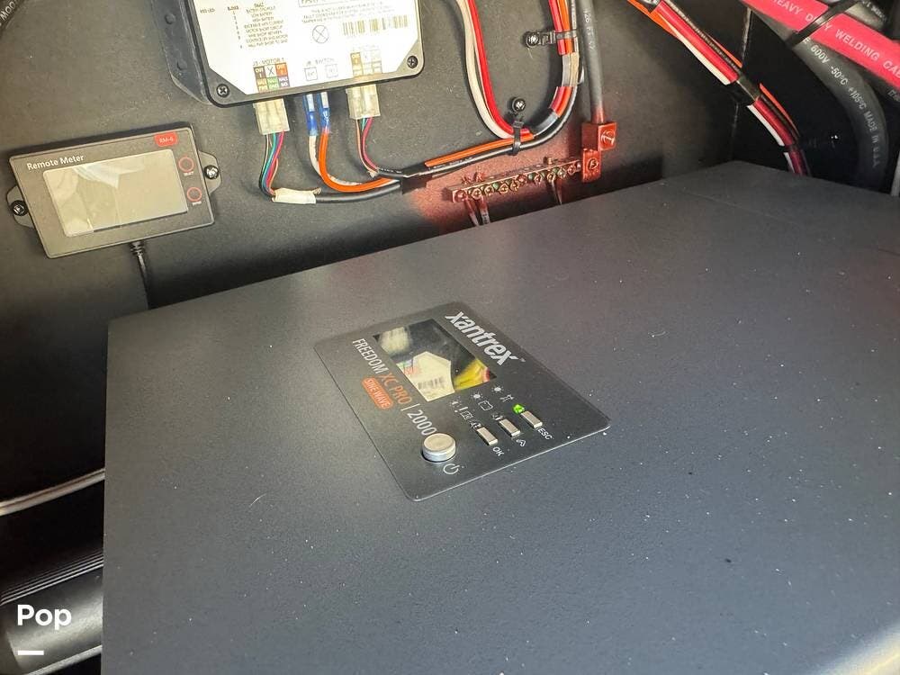 There is also a DVD player, rear video camera, Winegard Connect 2.0 rooftop antenna, 2000W true sine wave hybrid inverter, two 100AH AGM house batteries (optional lithium upgrade available), 3.2kW Onan generator, and a large skylight with screen and shade protection.
