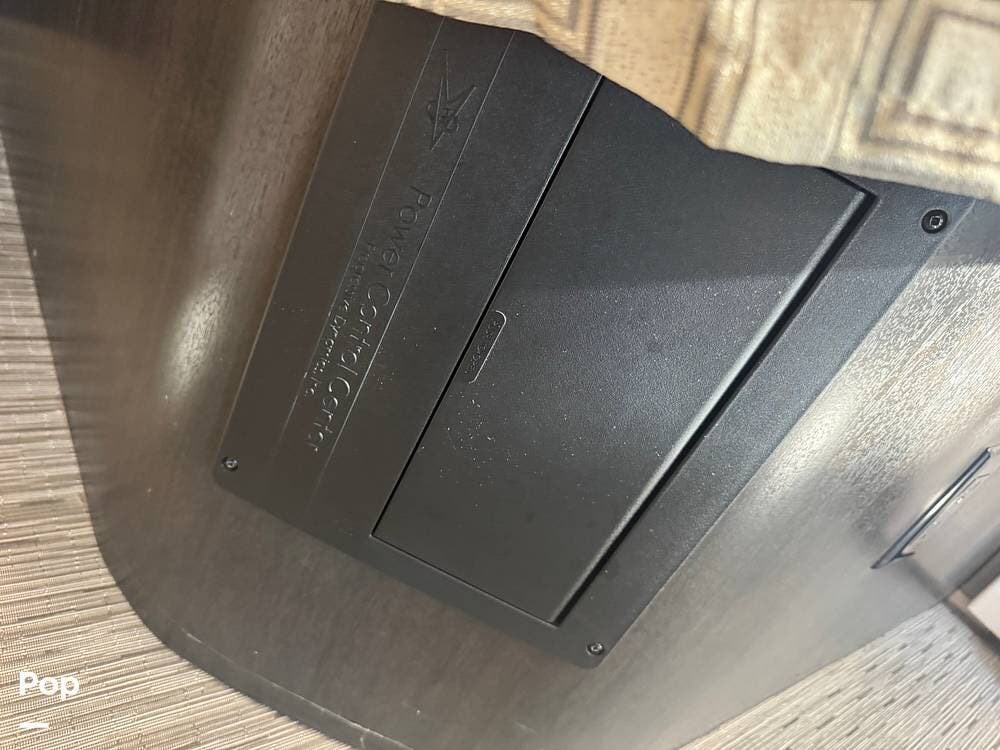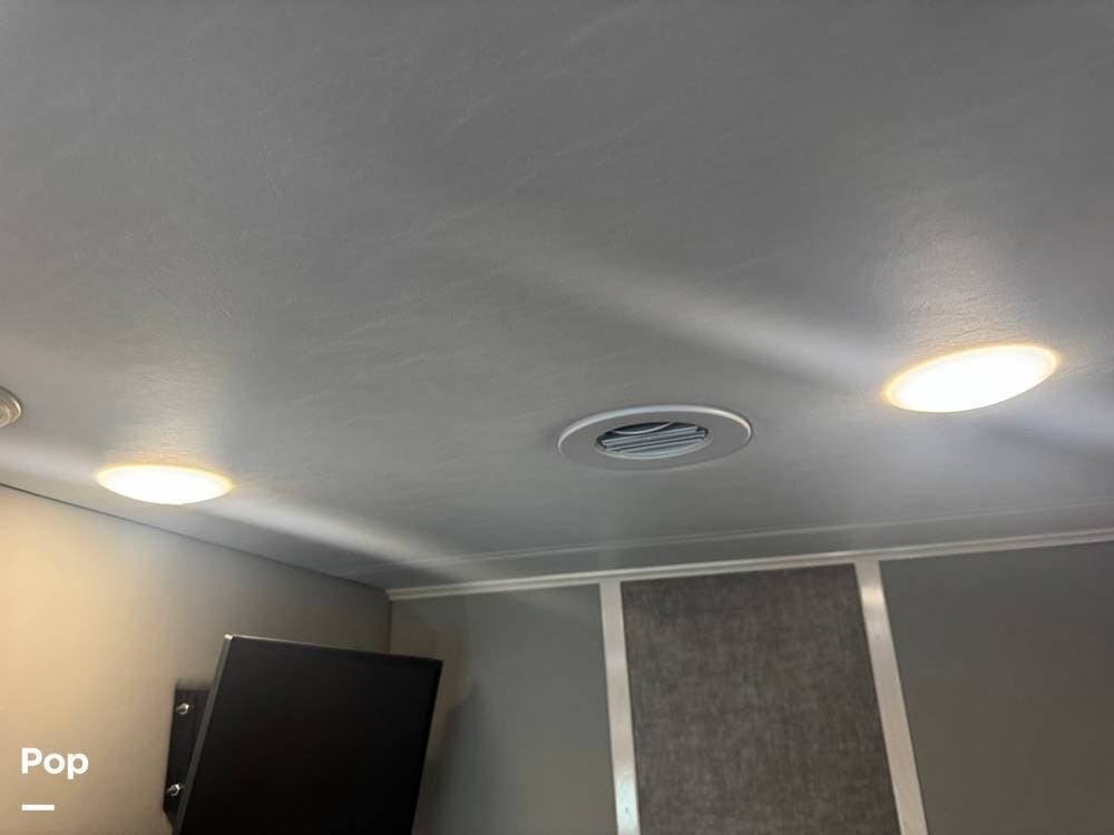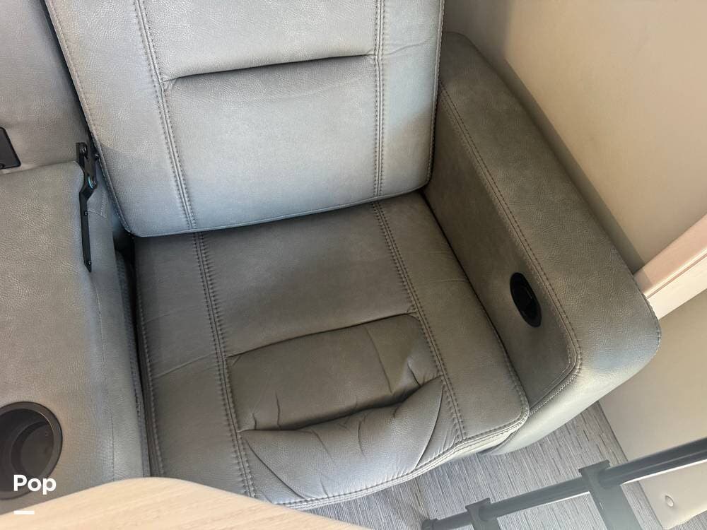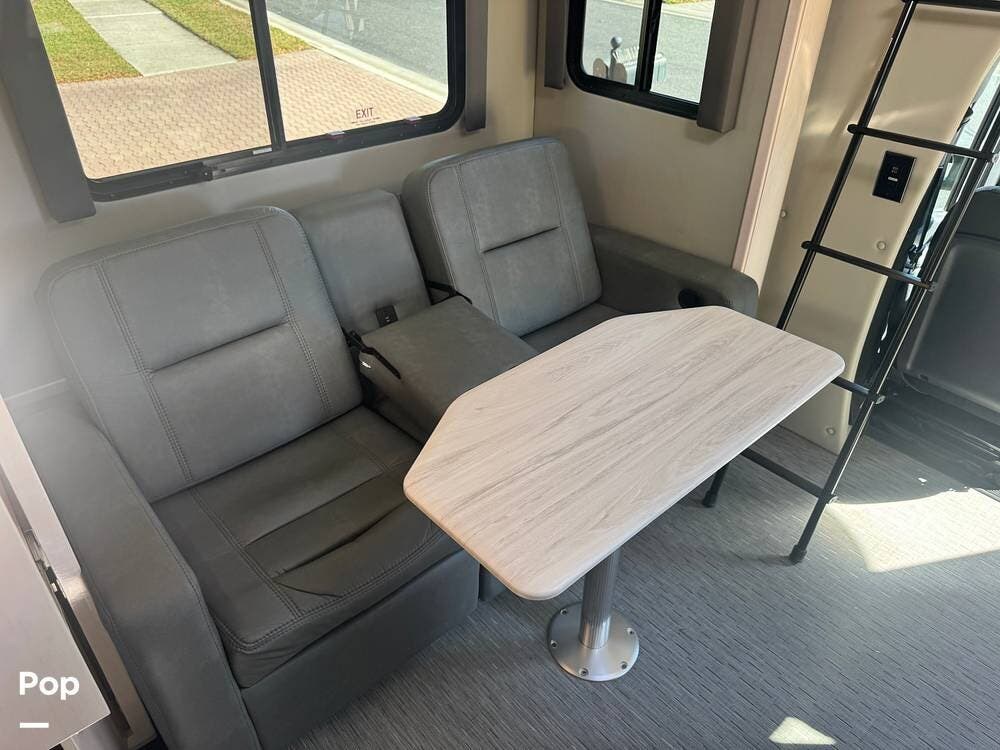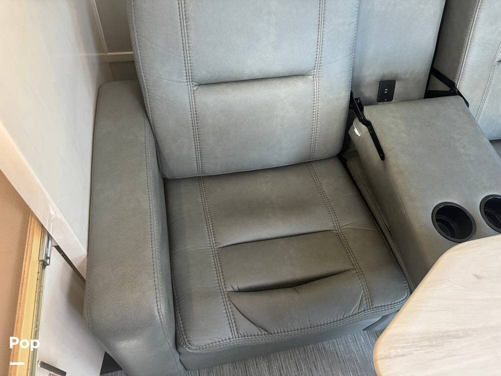 The main living area is well thought out, with twin stadium-style recliners facing the TV. It features a table perfect for dinner for two that can be removed when not in use. The front chairs are power-adjustable and both recline to become part of the main living area.