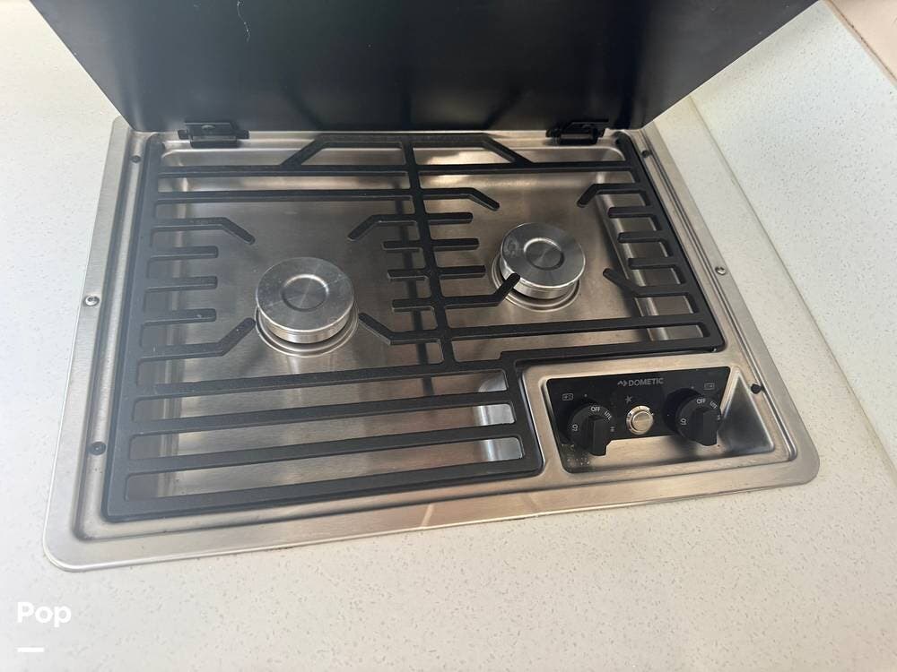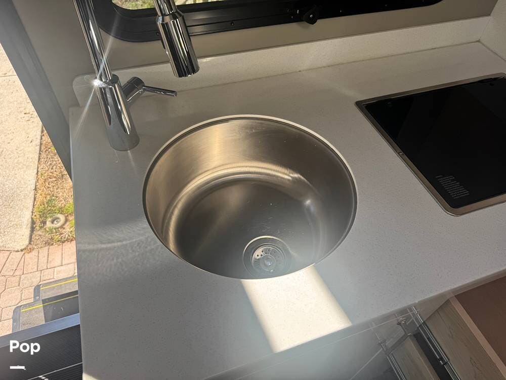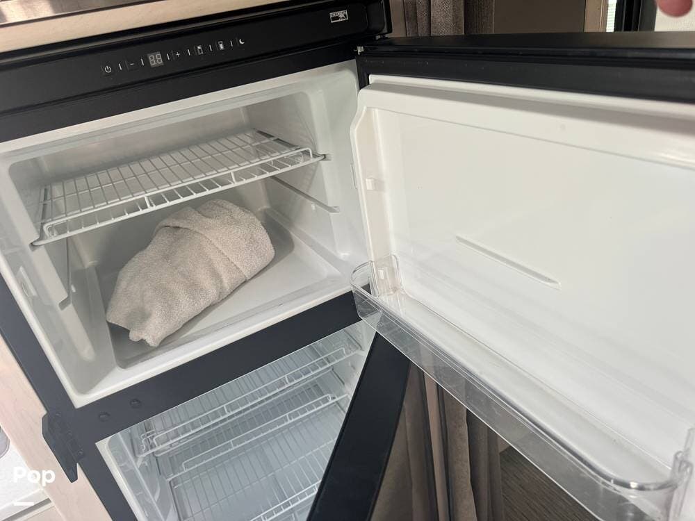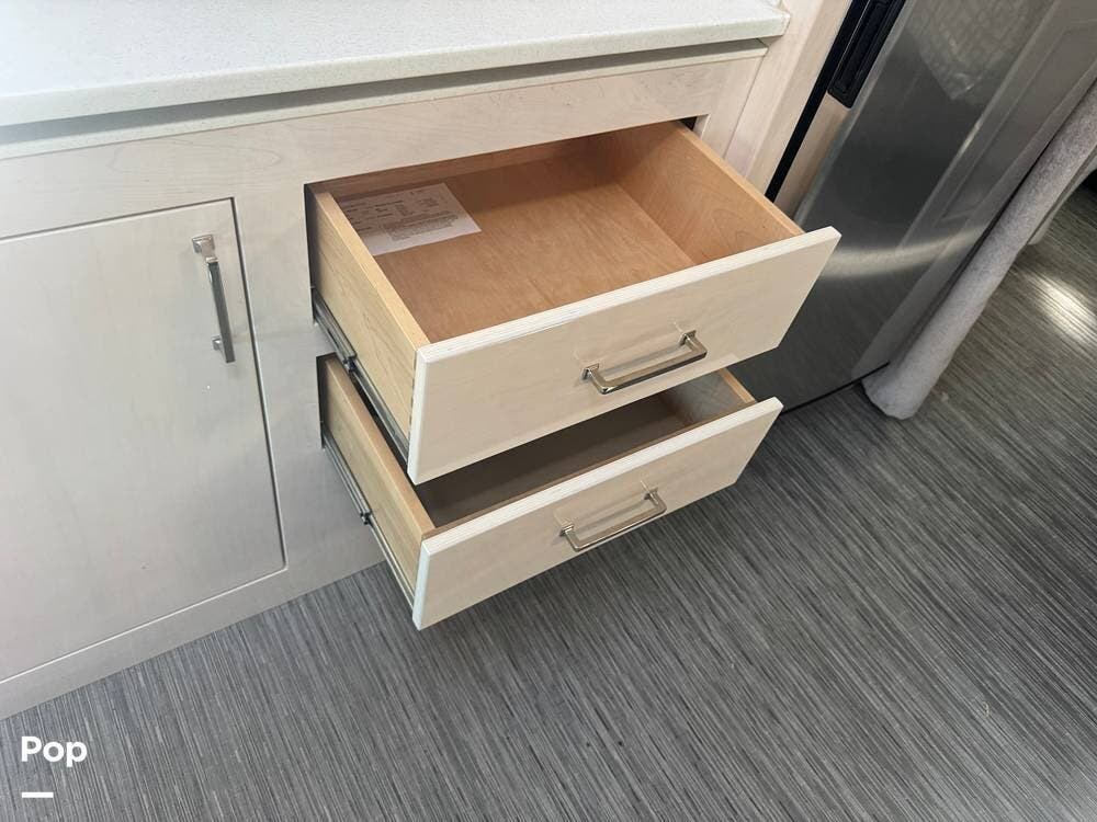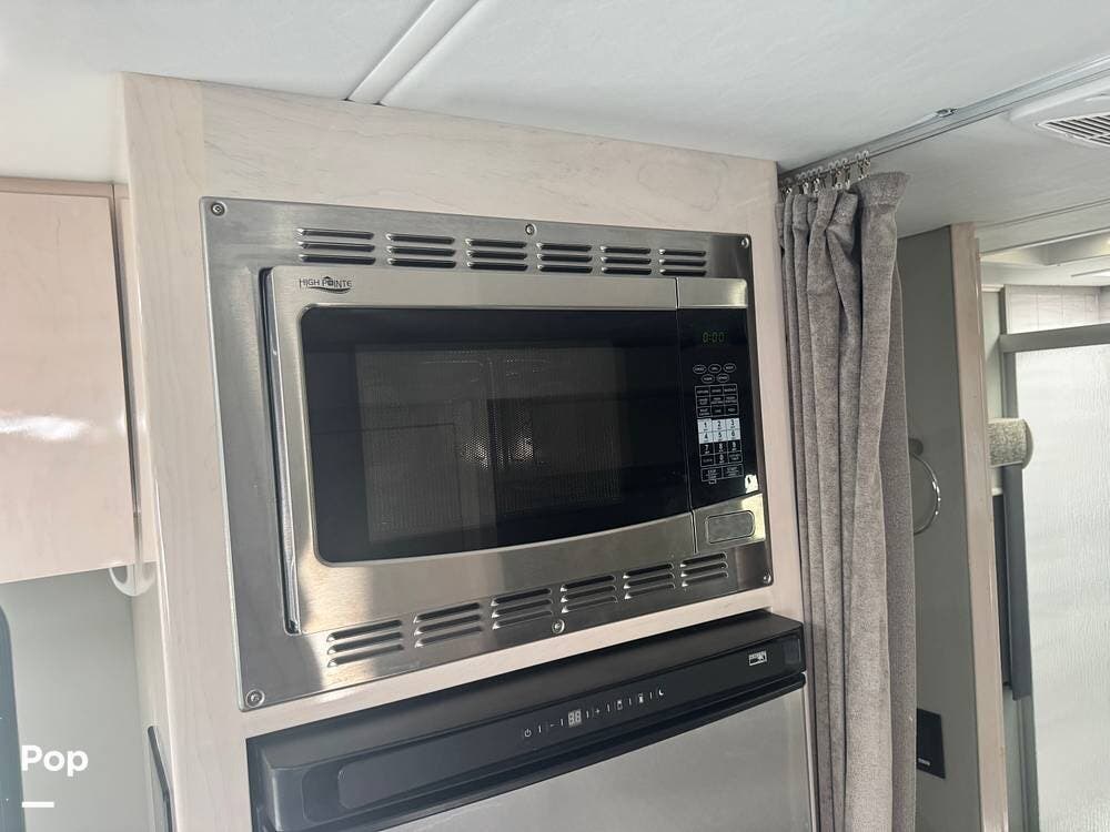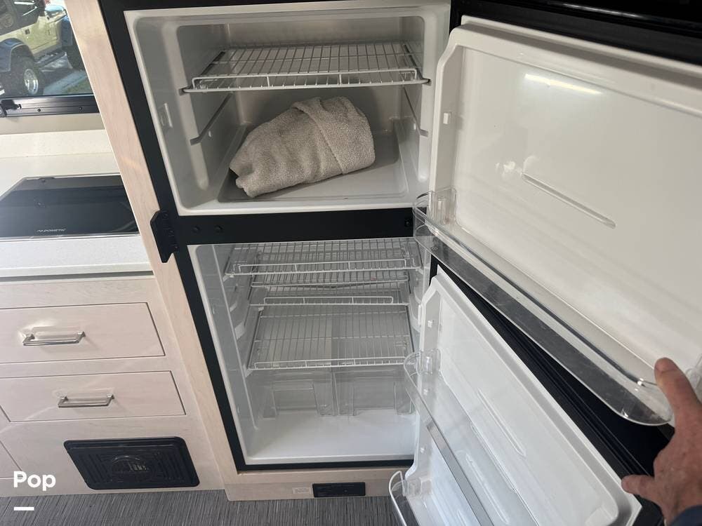 The galley is thoughtfully equipped with a stainless-steel sink, a convection microwave, a refrigerator, and solid-surface countertops -- everything needed to prepare meals with ease, whether you're at a campground or off the grid. There's even a nice pantry that pulls out for easy access as needed.