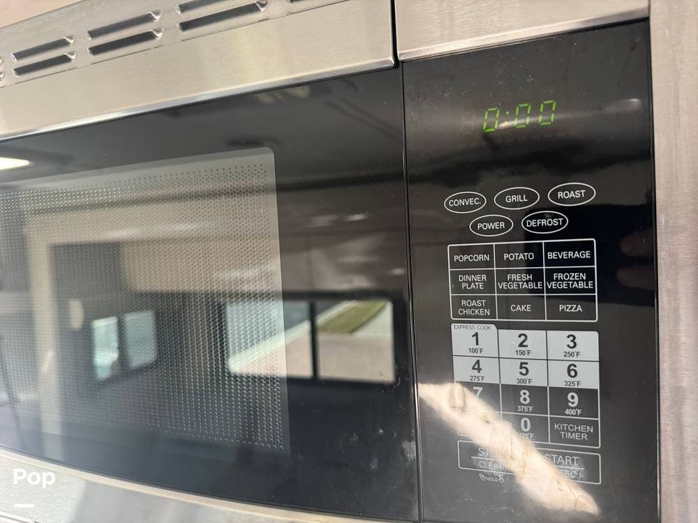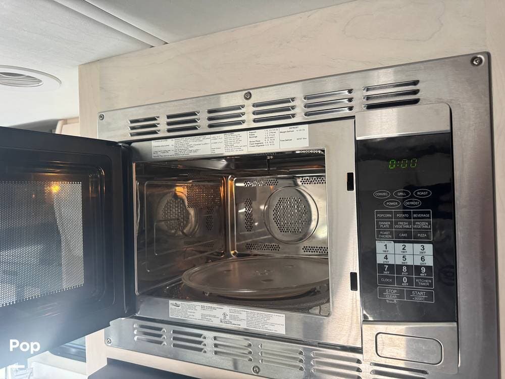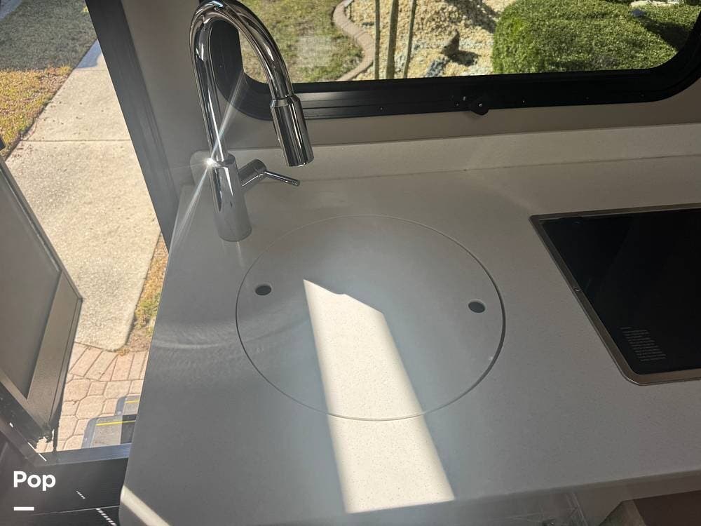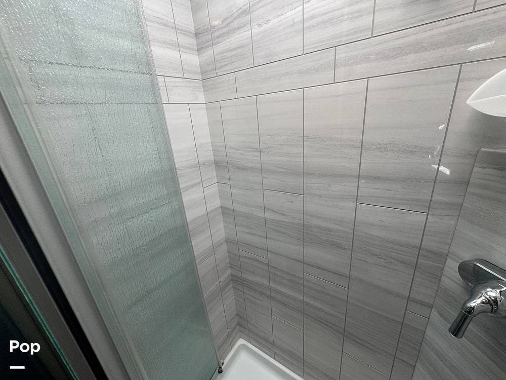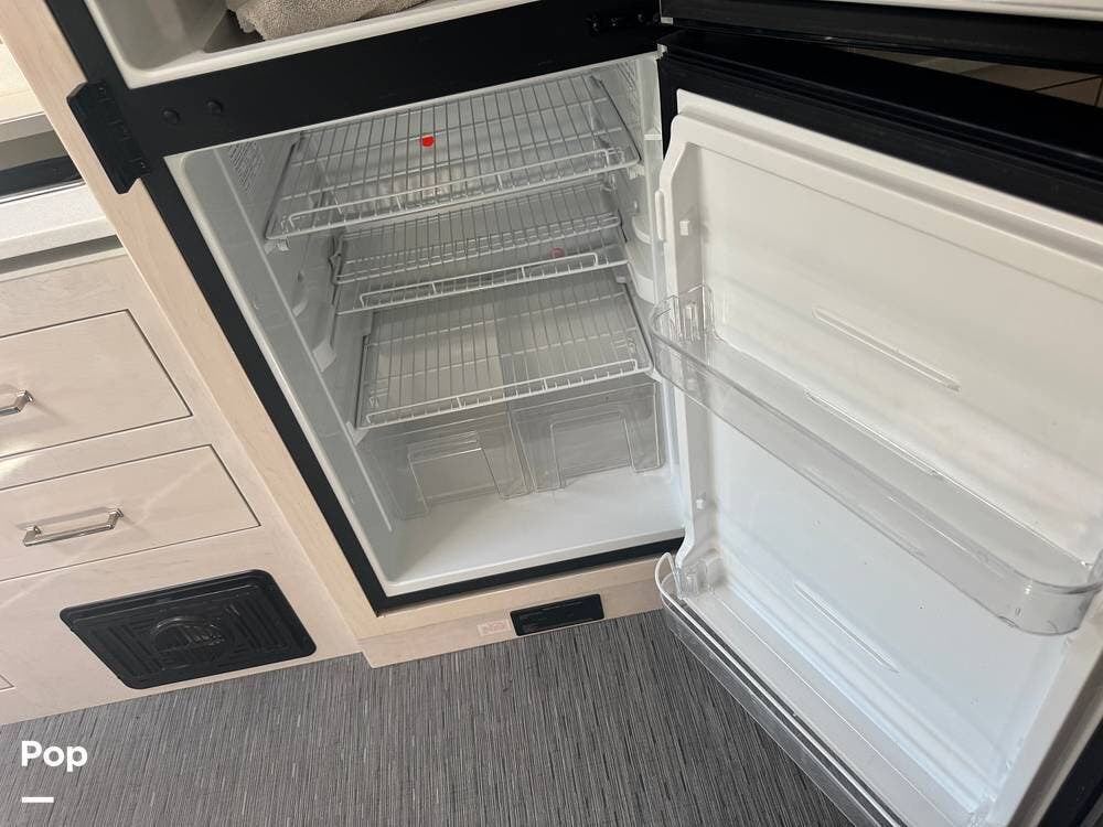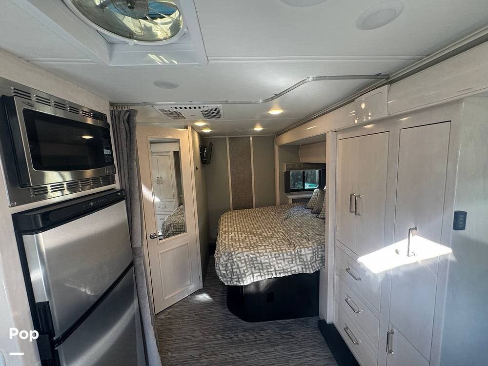 The galley is thoughtfully equipped with a stainless-steel sink, a convection microwave, a refrigerator, and solid-surface countertops -- everything needed to prepare meals with ease, whether you're at a campground or off the grid. There's even a nice pantry that pulls out for easy access as needed.