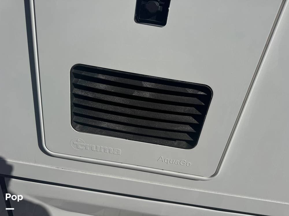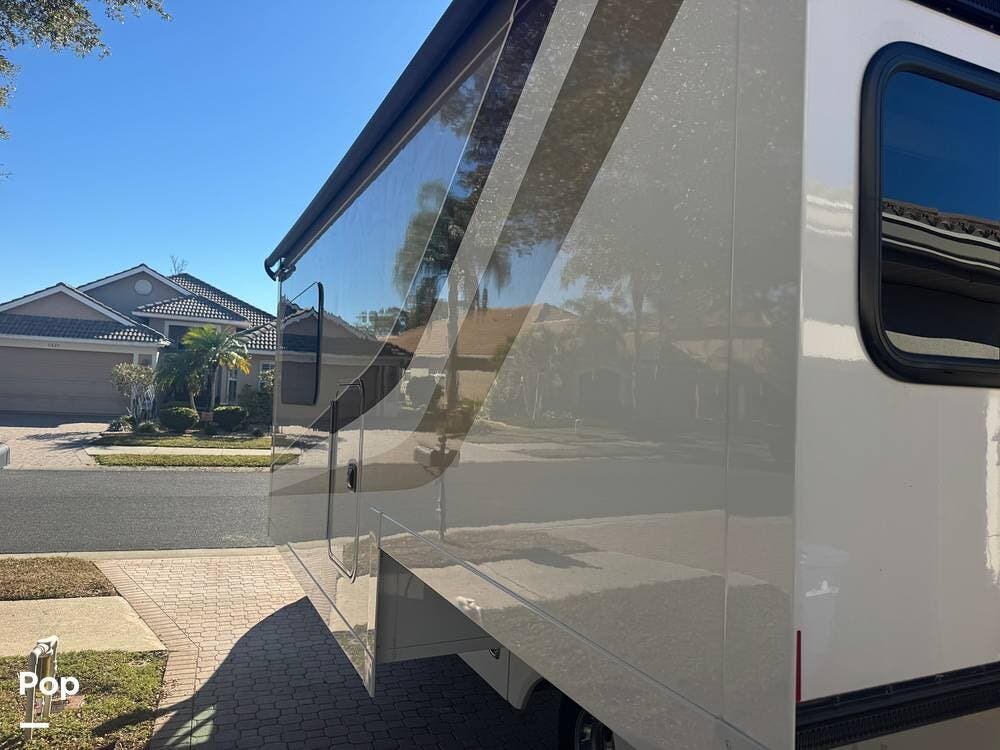 Other features include a full-wall slide with a topper awning, a full-length power awning with lateral arms and LED lights, a four-point hydraulic leveling system with app control, a Truma AquaGo Comfort Plus tankless water heater, a 13,500 BTU heat pump, and an 18,000 BTU ducted furnace.