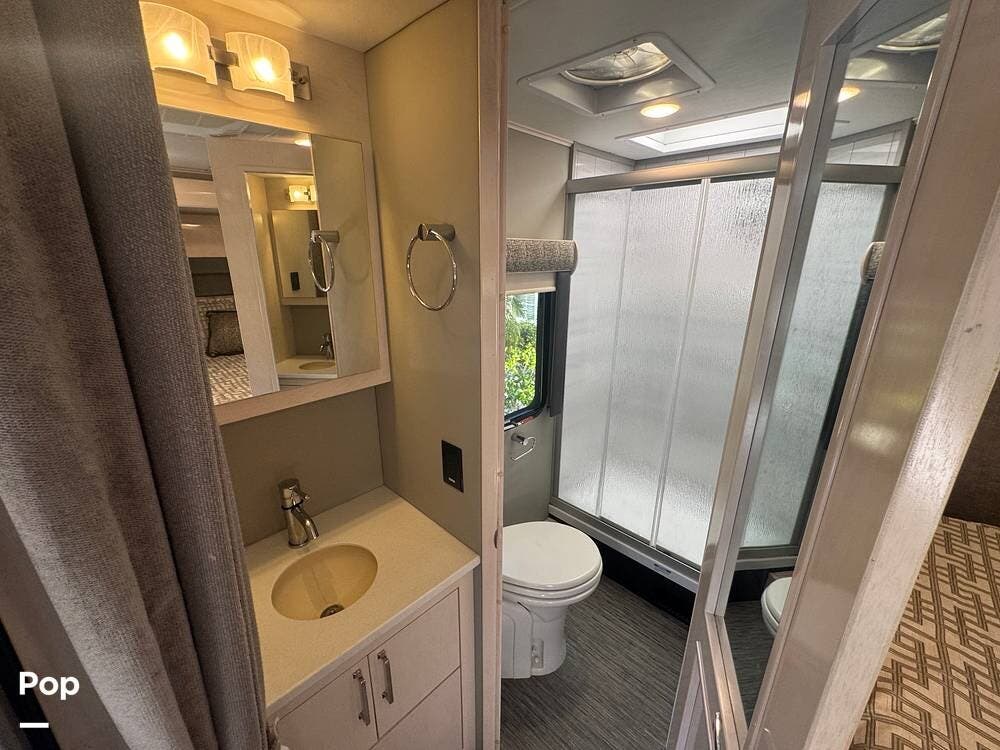 The bathroom is well-appointed with a residential-style shower, a sink, quality fixtures, and ample storage -- another example of Winnebago's attention to detail.