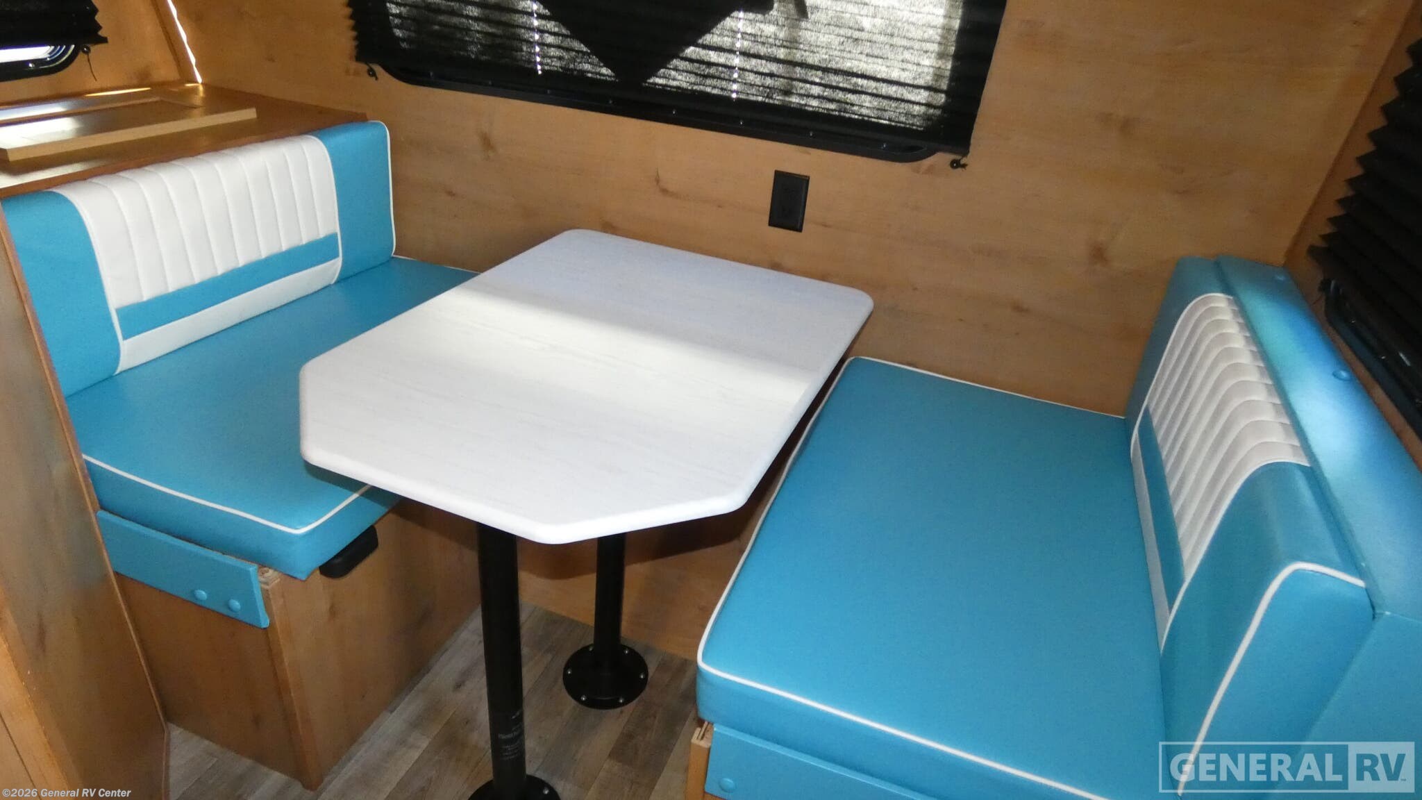 Riverside Retro travel trailer 179 highlights: Front Booth Dinette Four Burner Cooktop Rear Bedroom Egress Window Time spent in this travel trailer will be time well spent! Once you arrive at the campground, set up the 11' patio awning, then relax with a cold drink. You can play a game of cards at the booth dinette once you head inside, or freshen up in the full bath. This model also includes a fully-equipped kitchen and a rear bedroom with a walk-around queen bed! Each Retro travel trailer by Riverside RV will take you back in time with its vintage look, but will still impress you with its modern comforts. The double welded all-aluminum cage and powder coated chassis provide durability, along with the PVC roof membrane and diamond plate rock guard. You'll enjoy indoor and outdoor speakers, USB ports for your electronics, plus an AM/FM/Bluetooth stereo to play your favorite tunes. Each model also includes front and rear stabilizer jacks, electric brakes, a high speed roof vent, plus a 13,500 A/C to keep you cool during the hot summer camping months.
