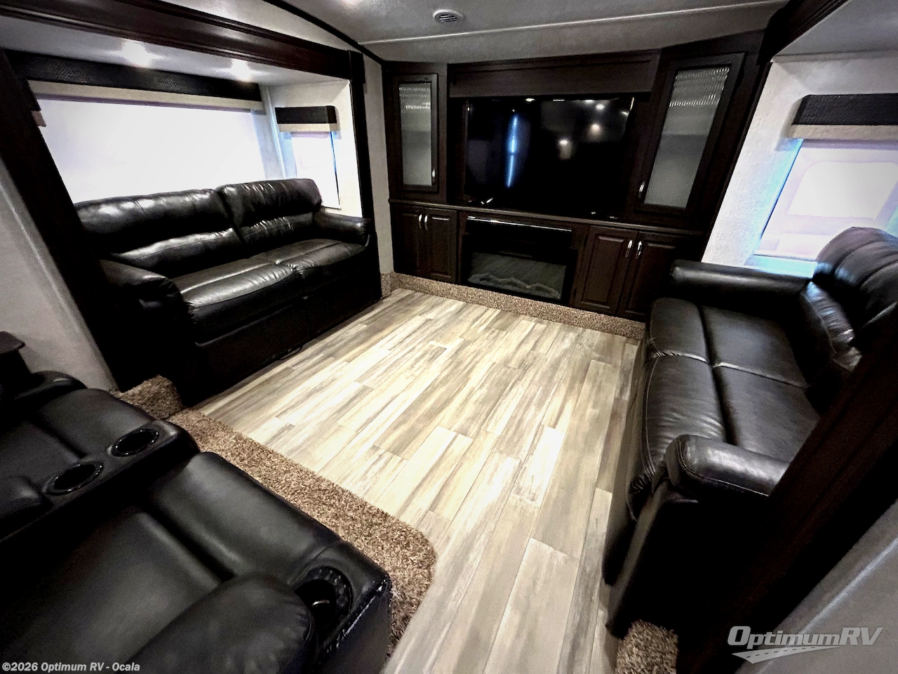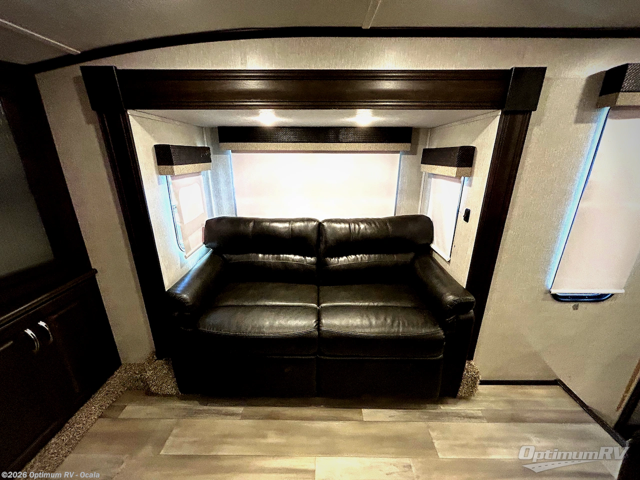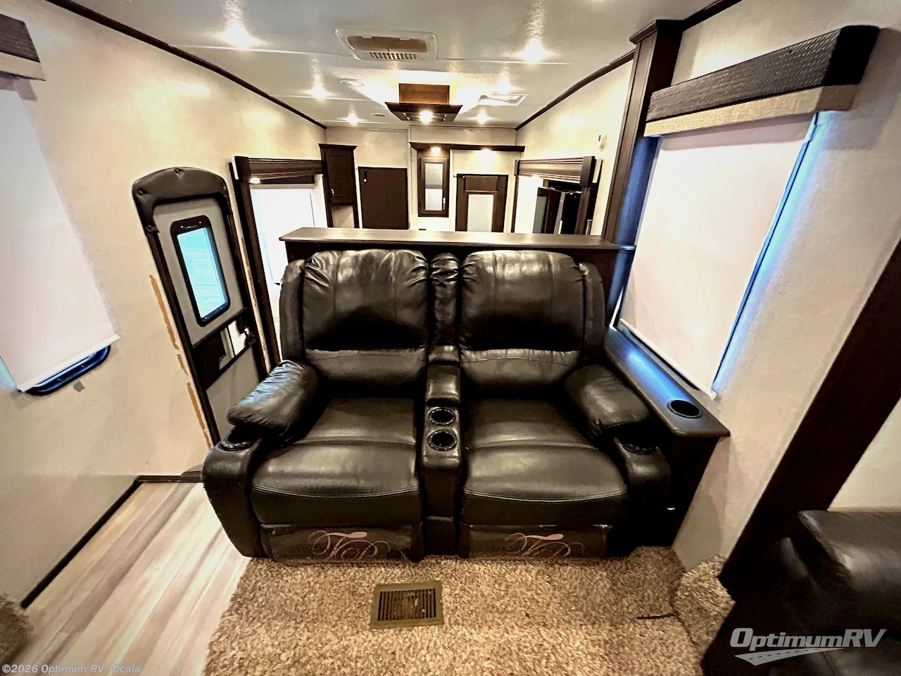 When you are looking for your own room in your next fifth wheel, this Phoenix will show you a spacious front living area with a front wall entertainment center, dual opposing tri-fold hide-a-bed sofas and theater seating that is separate from the centrally located kitchen. The main entry is within the kitchen and there is an island, a residential pantry, full kitchen amenities including a second pantry plus a free standing table with four chairs. The master suite offers a queen bed slide, clothing storage and a spacious rear bathroom with a shower including a seat and glass sliding doors, dual sink V-shaped vanity, and a space prepped for a washer/dryer.