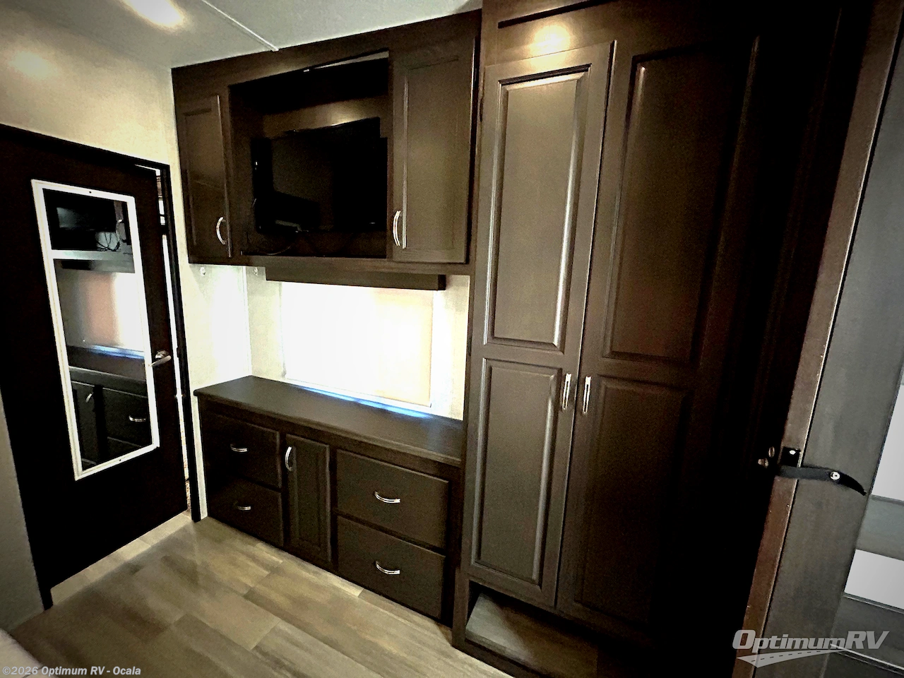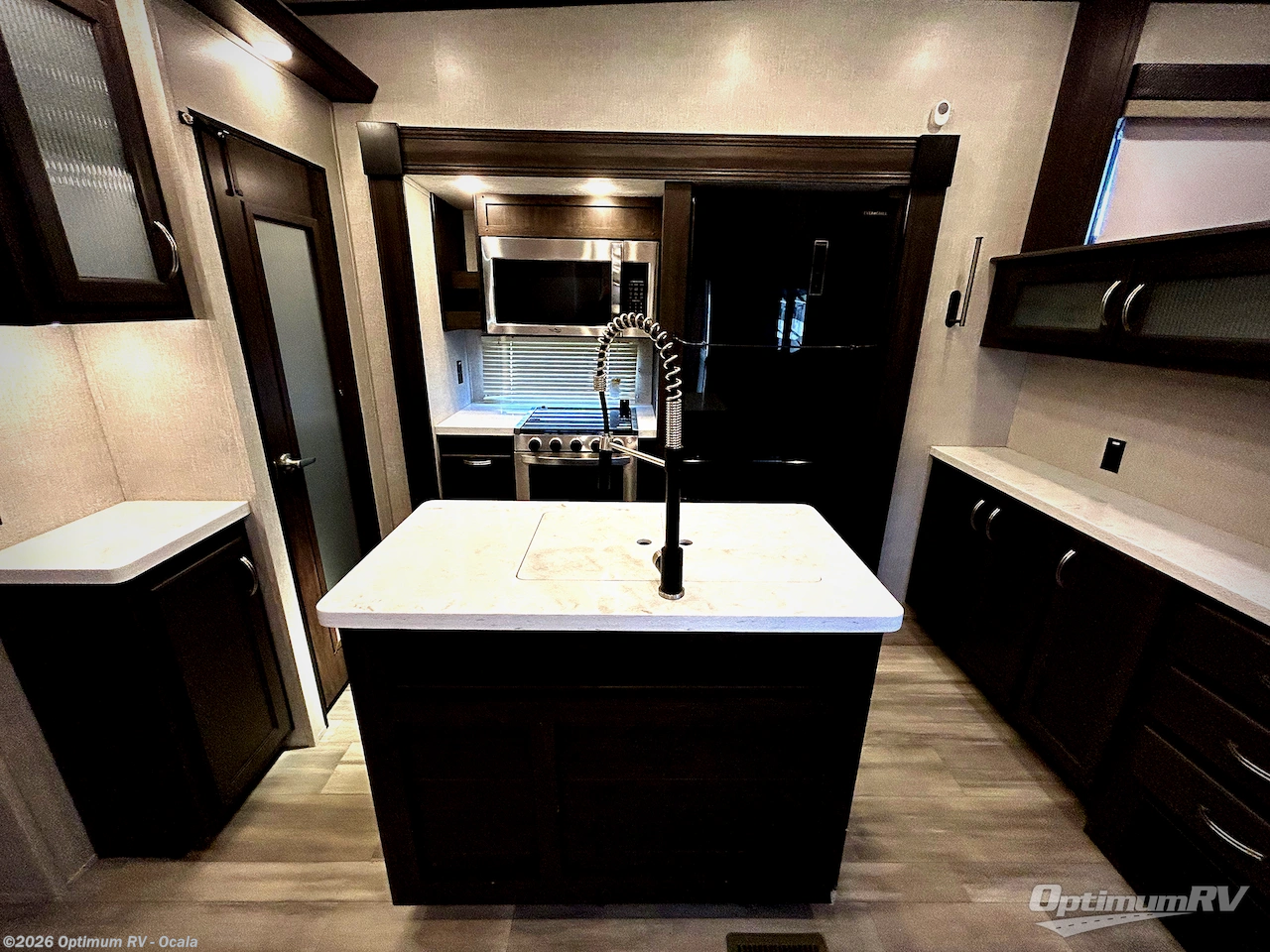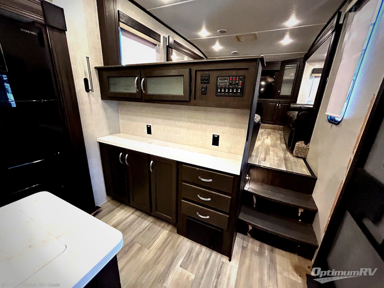 When you are looking for your own room in your next fifth wheel, this Phoenix will show you a spacious front living area with a front wall entertainment center, dual opposing tri-fold hide-a-bed sofas and theater seating that is separate from the centrally located kitchen. The main entry is within the kitchen and there is an island, a residential pantry, full kitchen amenities including a second pantry plus a free standing table with four chairs. The master suite offers a queen bed slide, clothing storage and a spacious rear bathroom with a shower including a seat and glass sliding doors, dual sink V-shaped vanity, and a space prepped for a washer/dryer.