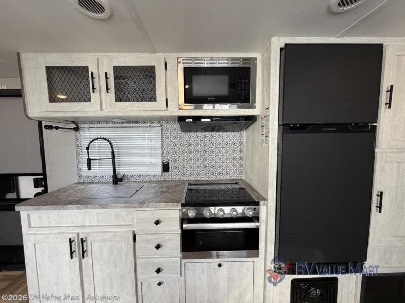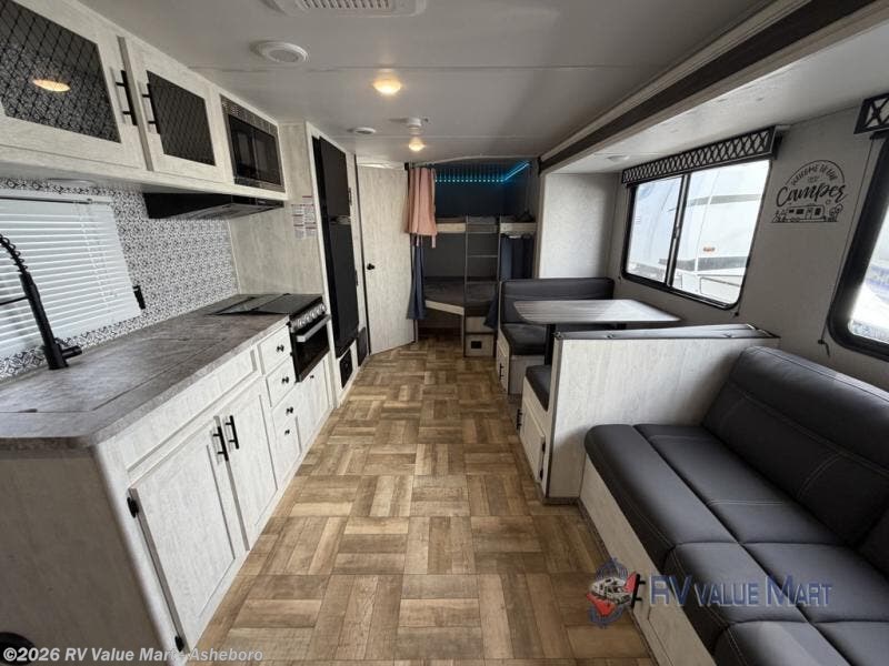 This trailer allows you to camp in comfort with conveniences such has having dual exterior entry doors allowing you access to the main area or the rear corner bathroom. The bathroom also has an interior entry that is next to the double-size bunks which is super convenient at night for the kiddos. You will also find floor storage under the bunks. The large slide out offers extra floor space inside to move about, and includes the booth dinette and sofa for inside relaxation and dining. The galley kitchen provides full amenities including a pantry and a 10 cu. ft. refrigerator for lots of food storage. And you can sleep like a queen in the front dual entry bedroom that offers plenty of clothing storage and an overhead shelf for more items.