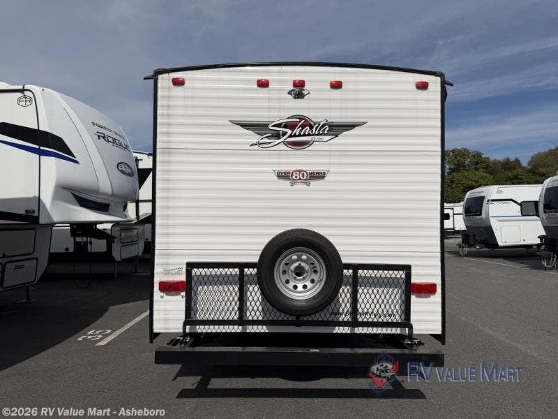 With each Shasta travel trailer by Shasta RVs, premium wood products are used such as 2x2 wall studs on 16" centers and 5/8" thick tongue and groove plywood floors. The 5" wood roof trusses support full walk-on roof decking wrapped with a seamless PVC membrane. Also included is a aerodynamic radius front profile, a front colored rock guard to protect against road debris, a straight axle with electric brakes, molded rain gutter with extra long spouts, a power tongue jack for easy setup, plus an oversized, lighted pass-through compartment with exterior access, and interior access under the bed. The interior offers decorative cabinet pulls, lighted cupholders with two USB chargers, a stainless steel sink, and more providing value and convenience. Rest easy when you purchase a lightweight Shasta that is built to last!