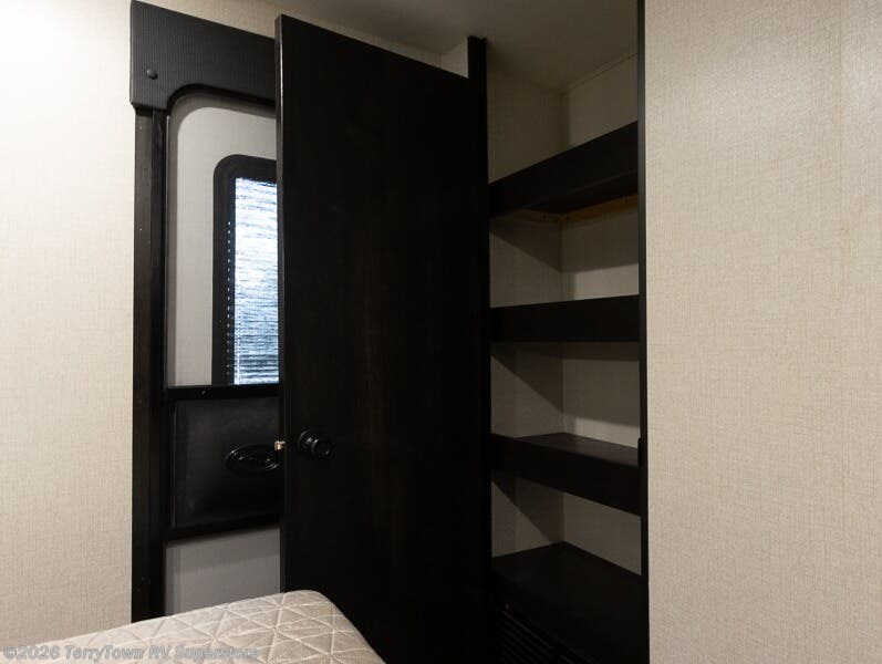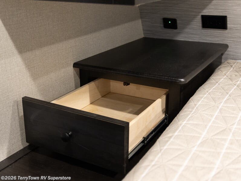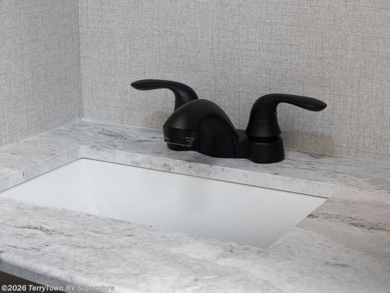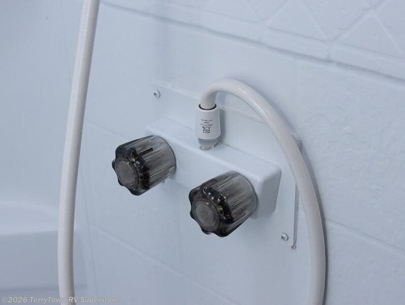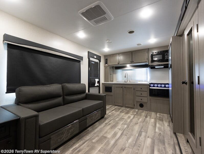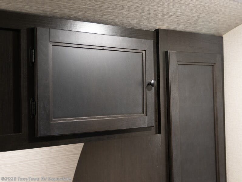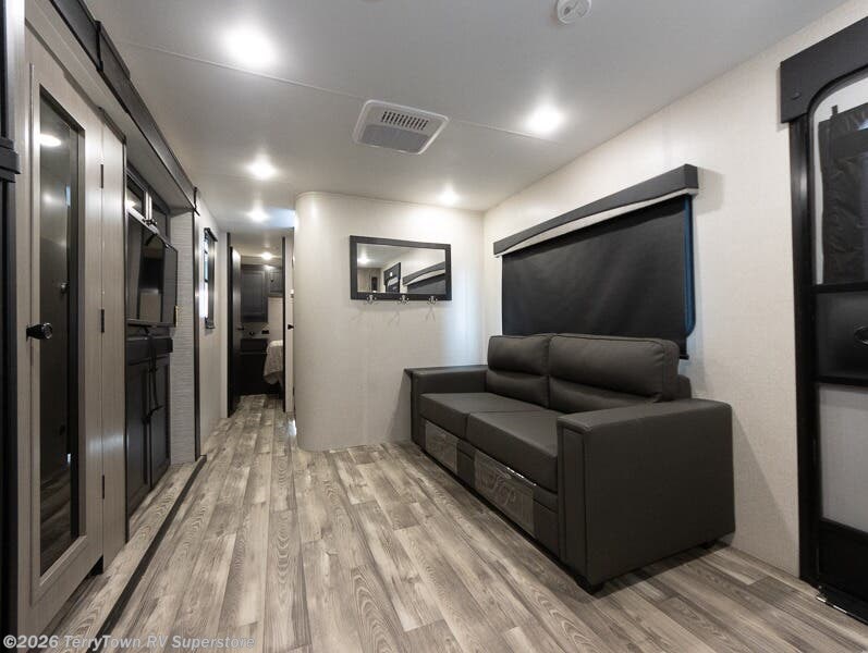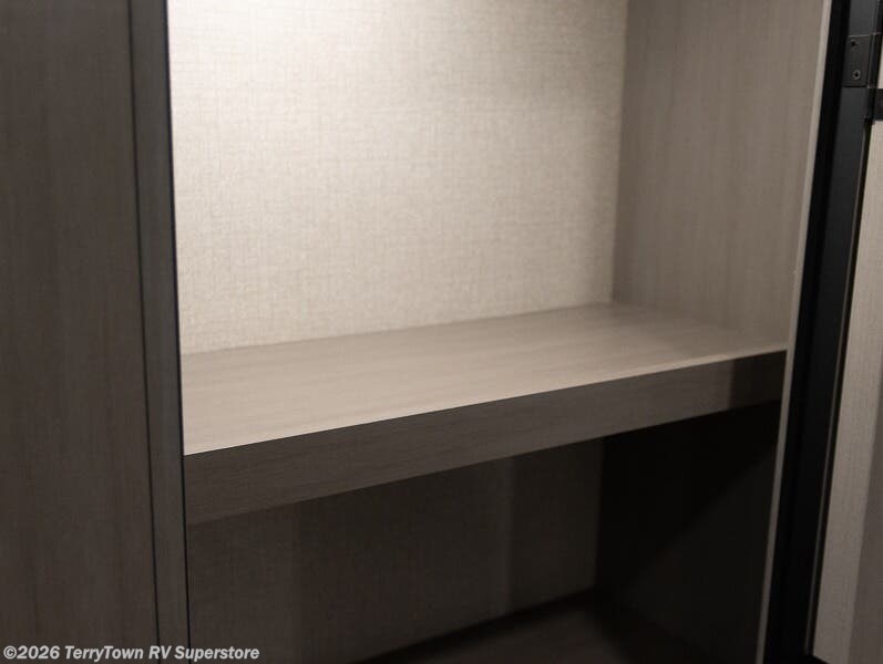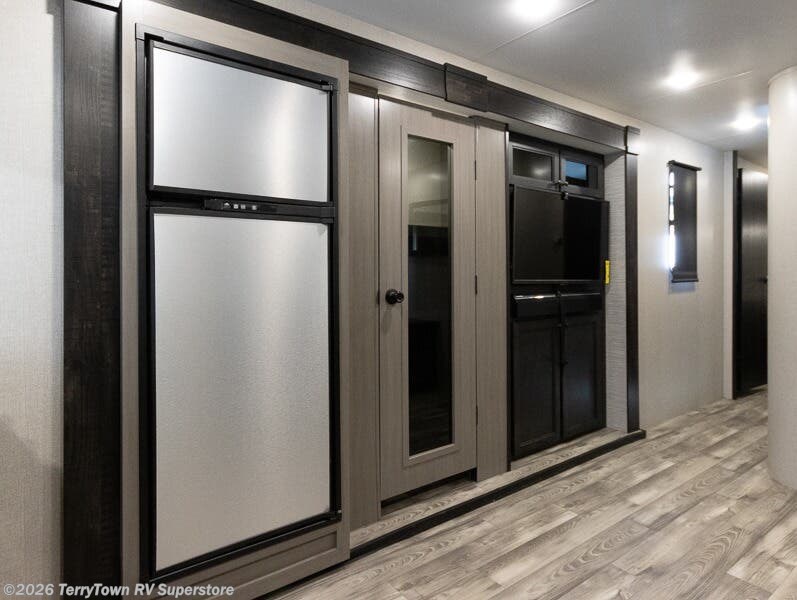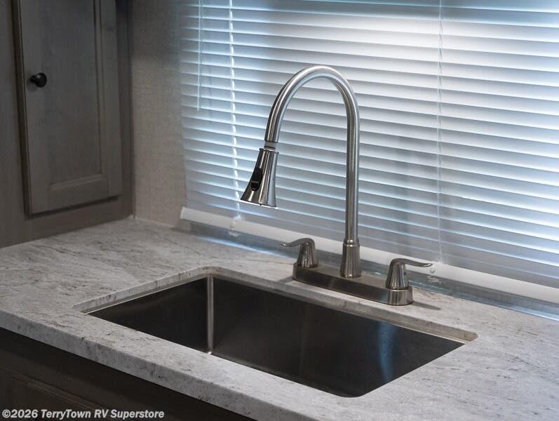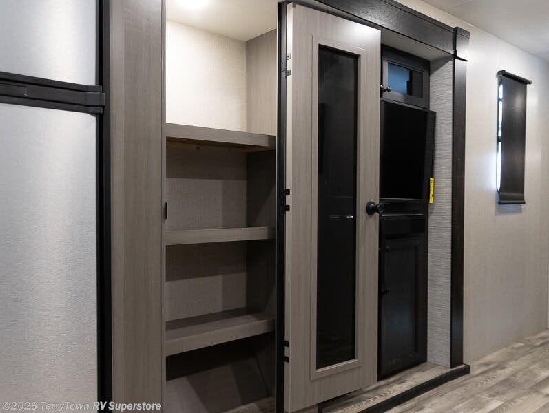 The cook will love the rear kitchen with counter space to prepare and serve meals, a single basin stainless steel under-mount kitchen sink with a residential high-rise faucet with pull-down sprayer to wash the veggies and fruit as well as the dirty dishes, and the appliances to keep everything warm. The 8 cu. ft. refrigerator is nearby as well as the large pantry. You can relax on the tri-fold sofa with table to lay your things and watch the LED HDTV/entertainment center before heading to the front bedroom with a queen bed, under bed storage, three wardrobes, a laundry chute, and electric outlets and USB ports. The second entry/exit door is also in this room giving you a place to sneak out to relax under the 21' power awning into the night.