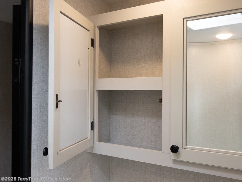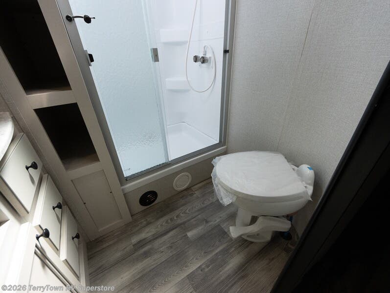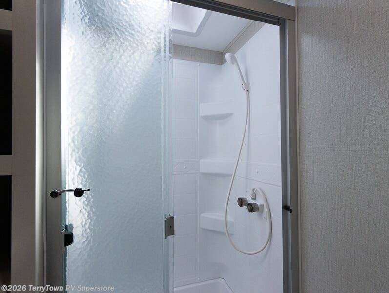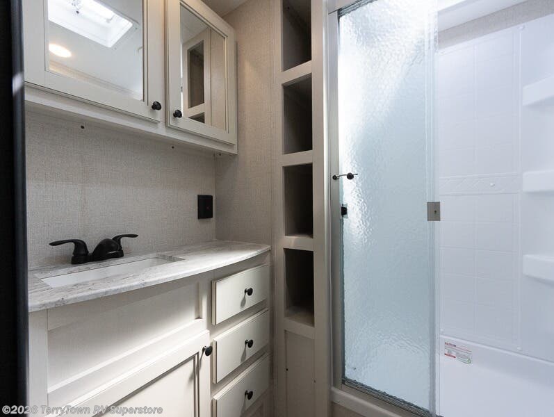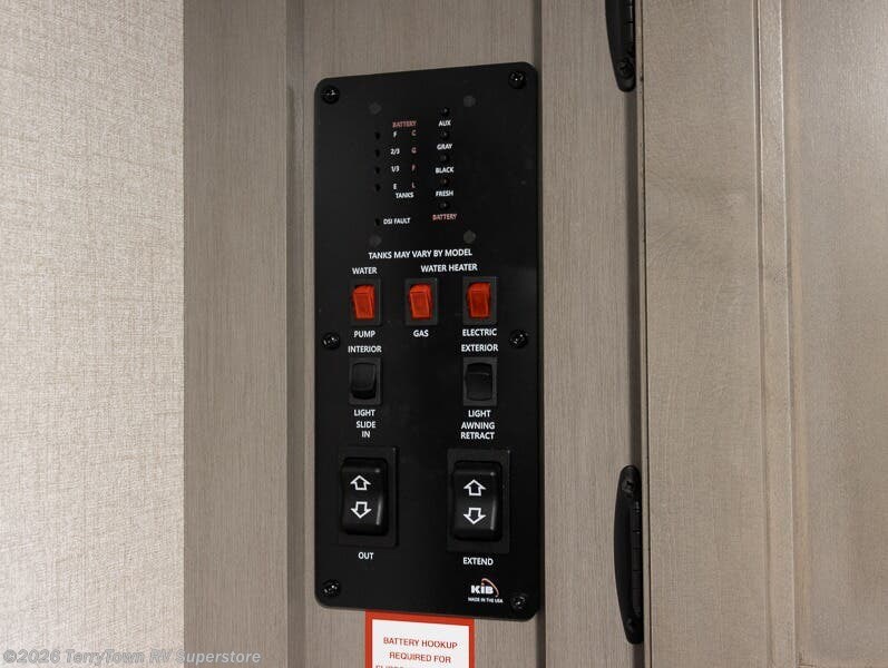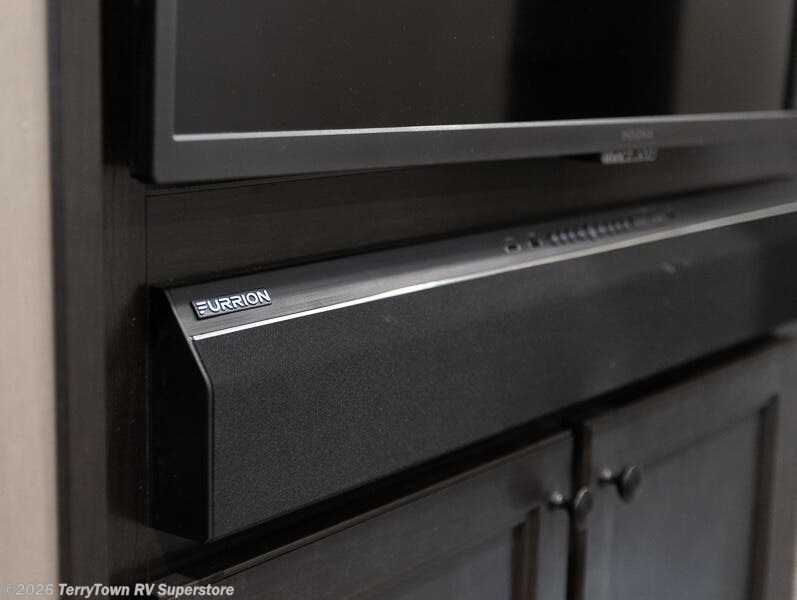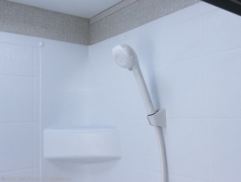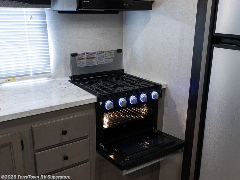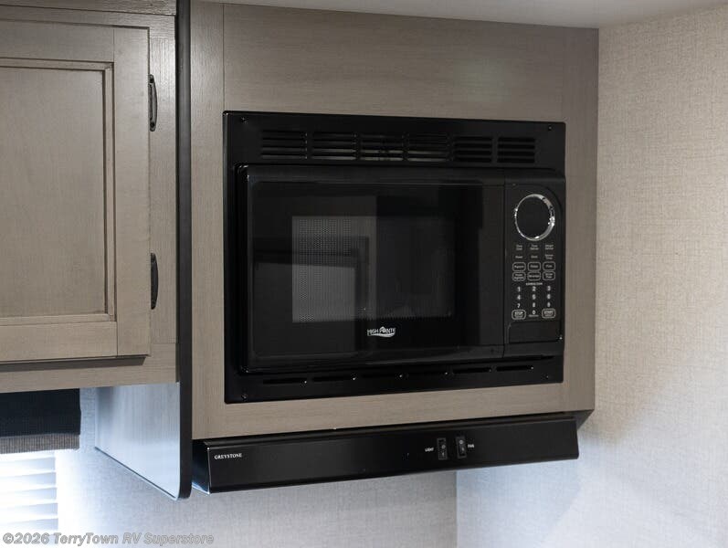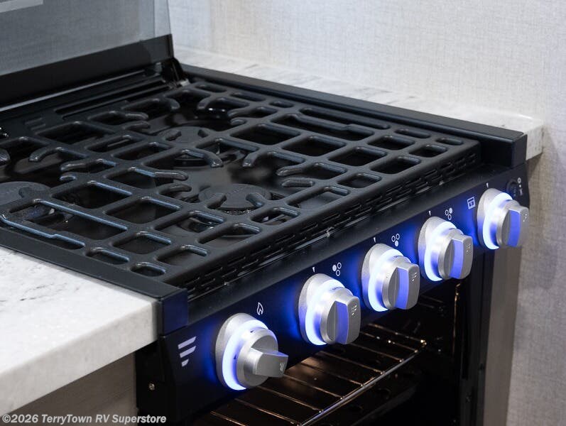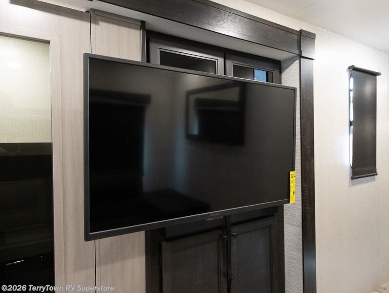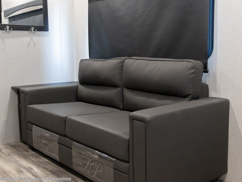 The cook will love the rear kitchen with counter space to prepare and serve meals, a single basin stainless steel under-mount kitchen sink with a residential high-rise faucet with pull-down sprayer to wash the veggies and fruit as well as the dirty dishes, and the appliances to keep everything warm. The 8 cu. ft. refrigerator is nearby as well as the large pantry. You can relax on the tri-fold sofa with table to lay your things and watch the LED HDTV/entertainment center before heading to the front bedroom with a queen bed, under bed storage, three wardrobes, a laundry chute, and electric outlets and USB ports. The second entry/exit door is also in this room giving you a place to sneak out to relax under the 21' power awning into the night.