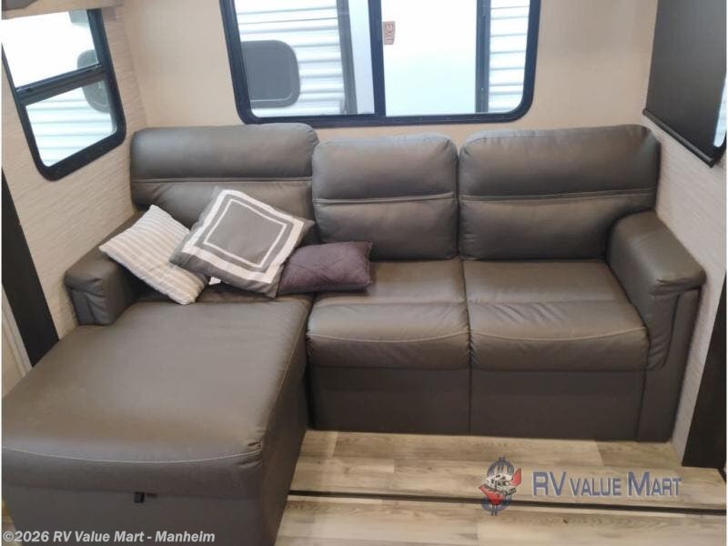 Get ready for some fun and relaxation with this trailer setup at your favorite campground! After enjoying the outdoors and everything it has to offer, you can whip up a meal in the galley kitchen with full amenities and clean the dishes with a single basin stainless steel under-mount kitchen sink with a residential high-rise faucet with pull-down sprayer. The LED HDTV will provide inside entertainment as you relax on the L-shaped sofa with table to dine at, and this space doubles as a sleeping area at night. The front bedroom offers a privacy curtain, a queen bed with under bed storage, dual wardrobes, a laundry chute, and electric outlets and USB ports. And everyone can take turns getting cleaned up in the rear corner bathroom which offers linen storage after hanging out under the 12' power awning.