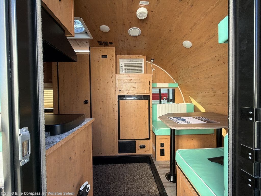 This Sunray travel trailer is the largest and most accommodating because it comes with a wet bath so that you can even take a shower in your trailer! There is a small kitchen on the interior that comes with a two-burner stove top, a refrigerator, and a microwave so that you can cook dinner without having to start a fire, and since it is indoors, you will be able to keep the bugs away while you prepare something delicious to eat. If you need to rinse off some gear, the outside shower will be especially useful, and if you need to charge your devices, use the USB ports. You will also find a Winegard HDTV antenna on this model. Add the available Classic option for 14" tires instead of the off-road version, color matching rims with Moon Caps, and Retro decor and Diner-Style countertops.