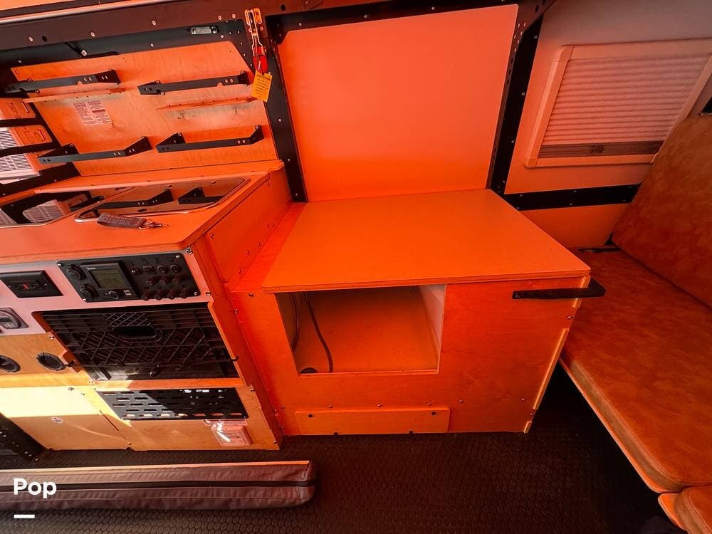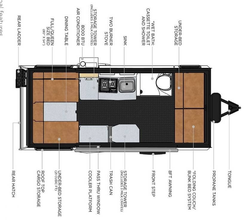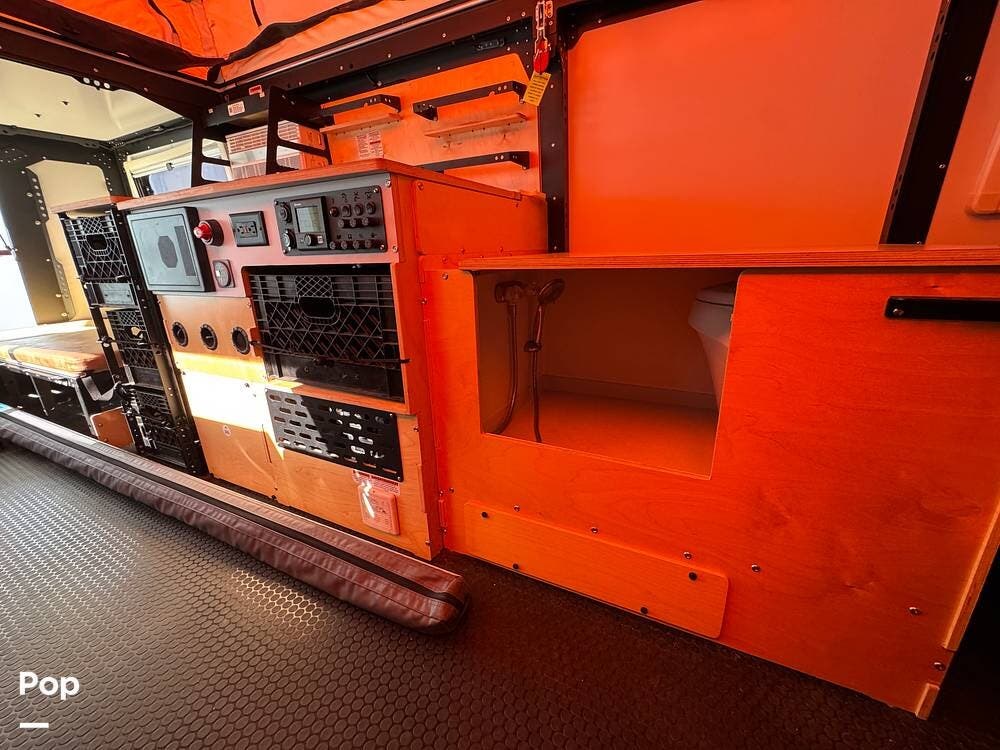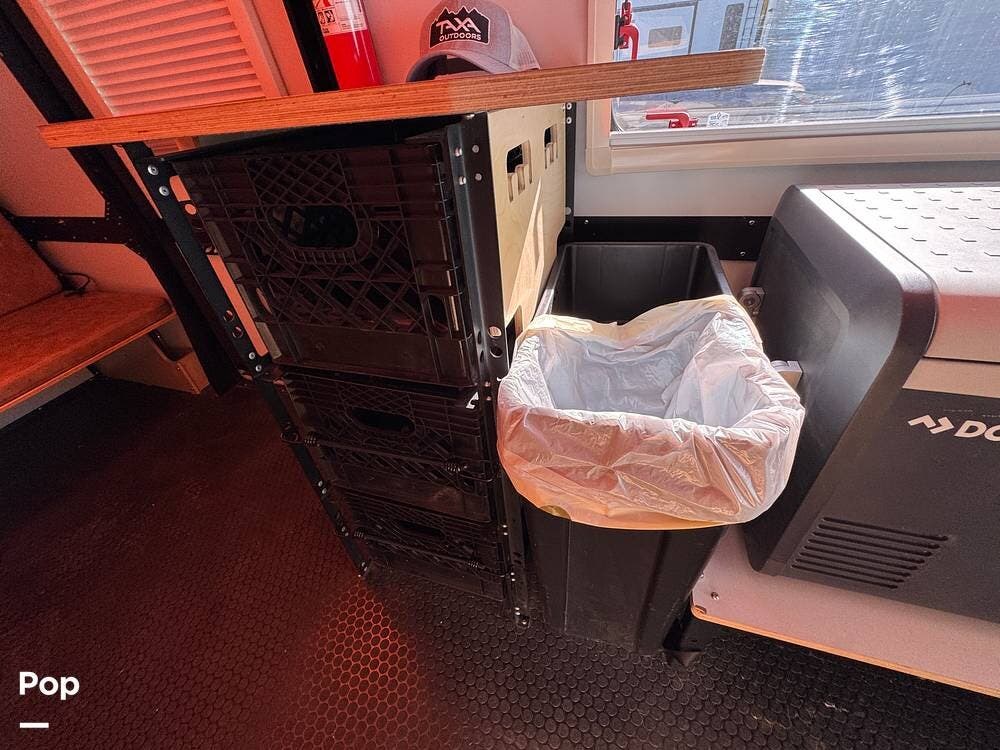 The kitchen area includes a stove and mini fridge/freezer, while the flexible milk crate drawer storage system provides customizable and rugged organization throughout the cabin.