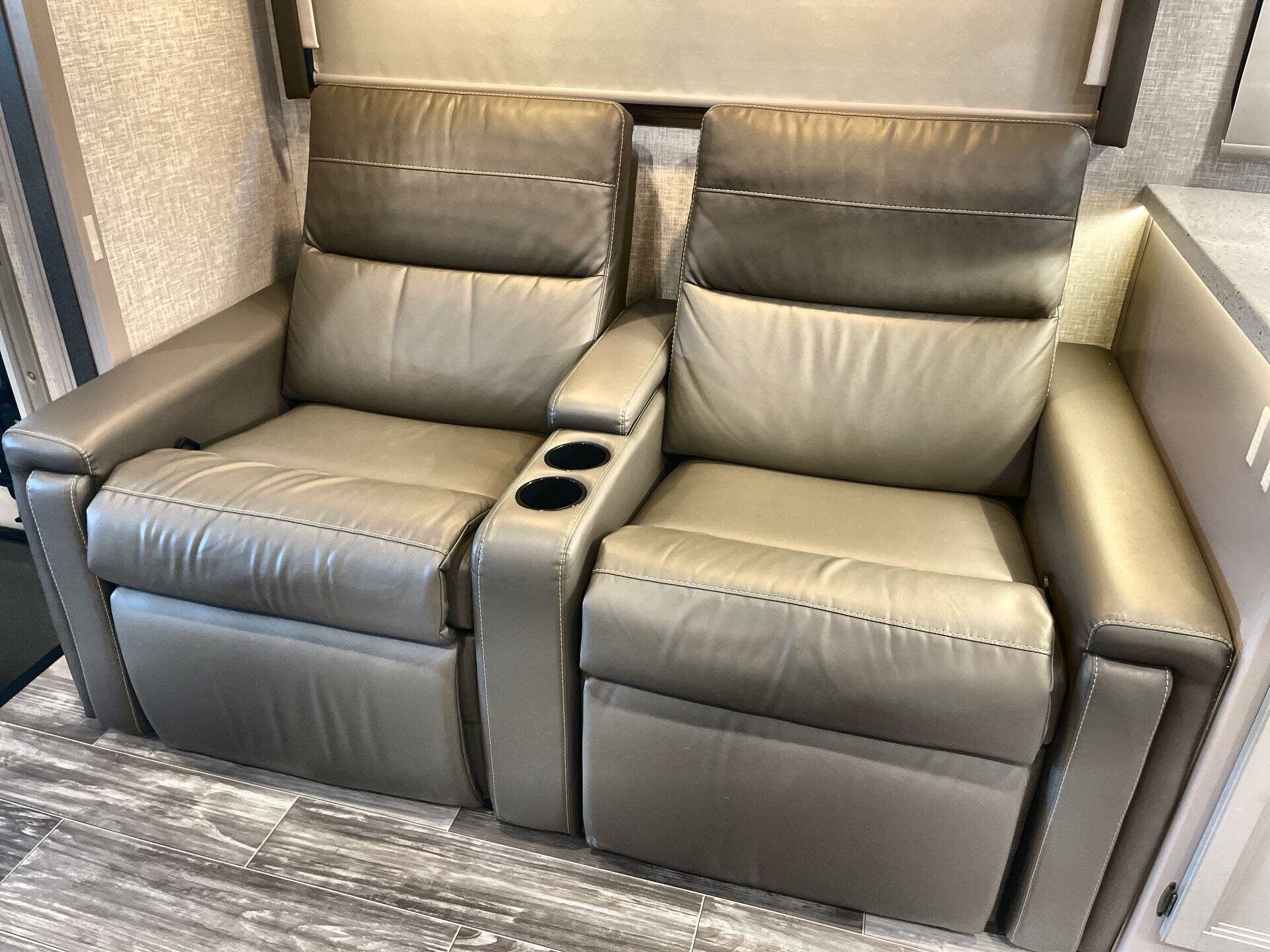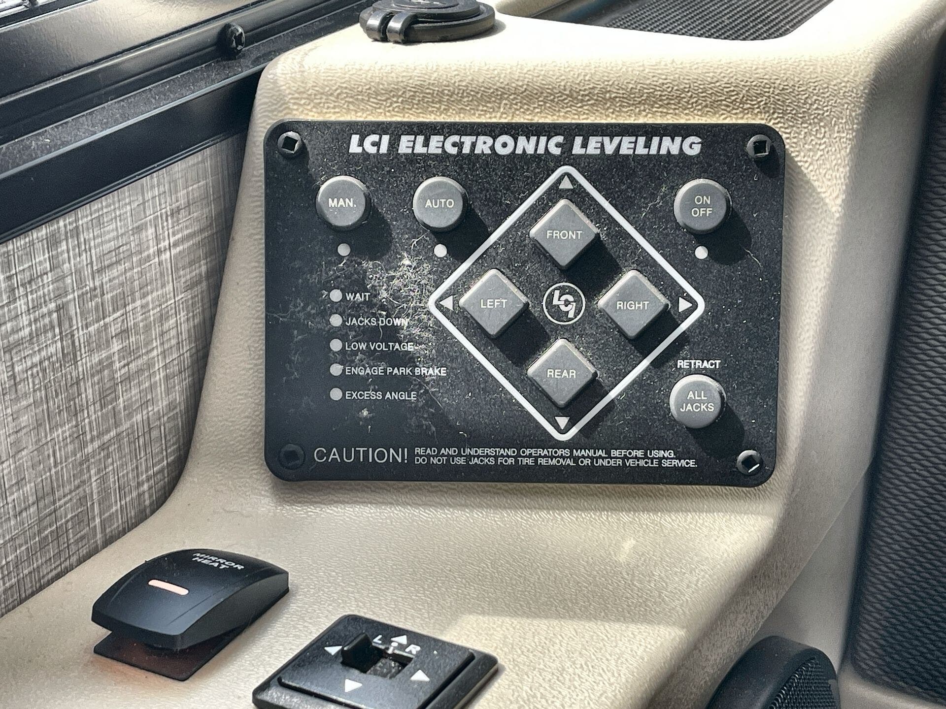 Inside this motorhome, the Hurricane 34R centers around a Front Living Area with a Front Entertainment layout, complemented by a Mid Kitchen and a Rear Bedroom. The two slideouts expand the living space, creating a generous area for relaxing, dining, and entertaining. A well-equipped galley includes microwave, oven, stove and a refrigerator, making meal prep easy on the road. The sofa-and-chair arrangement provides casual seating while the power TV keeps everyone connected. The rear bedroom delivers a quiet retreat with ample storage and closet space, ideal after long days at the campground. A full bath with shower, toilet, medicine cabinet, and essential safety devices round out daily living in comfort and security. This motorhome also features an exterior awning, backup monitor, and a dependable generator for off-grid trips.