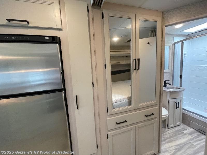 You can't beat the comfort found in this spacious motorhome. Once you park, the kids can take a rest on the drop-down overhead bunk that includes a ladder for easy access. The dream dinette provides a place to enjoy lunch at, and the jack-knife sofa is right across from the 39" TV to check the weather before a hike. After the dishes are cleaned up in the oversized stainless steel single bowl sink, the leftovers can go in the double door refrigerator. This model includes a convenient pantry and a coat/broom closet with hanging hooks to keep your jackets and shoes tidy. You will love the king bed slide out in the private bedroom, along with a 32" TV and quick access to the full bath!