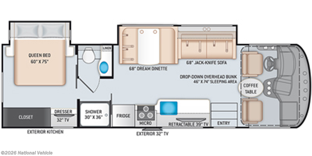 The coach is fully equipped and road-ready, featuring a Tire Pressure Monitoring System (TPMS) for added safety and convenience while traveling. You?ll also appreciate the added bonus of a full tank of gas and a full tank of propane?allowing you to hit the road immediately without any extra stops.