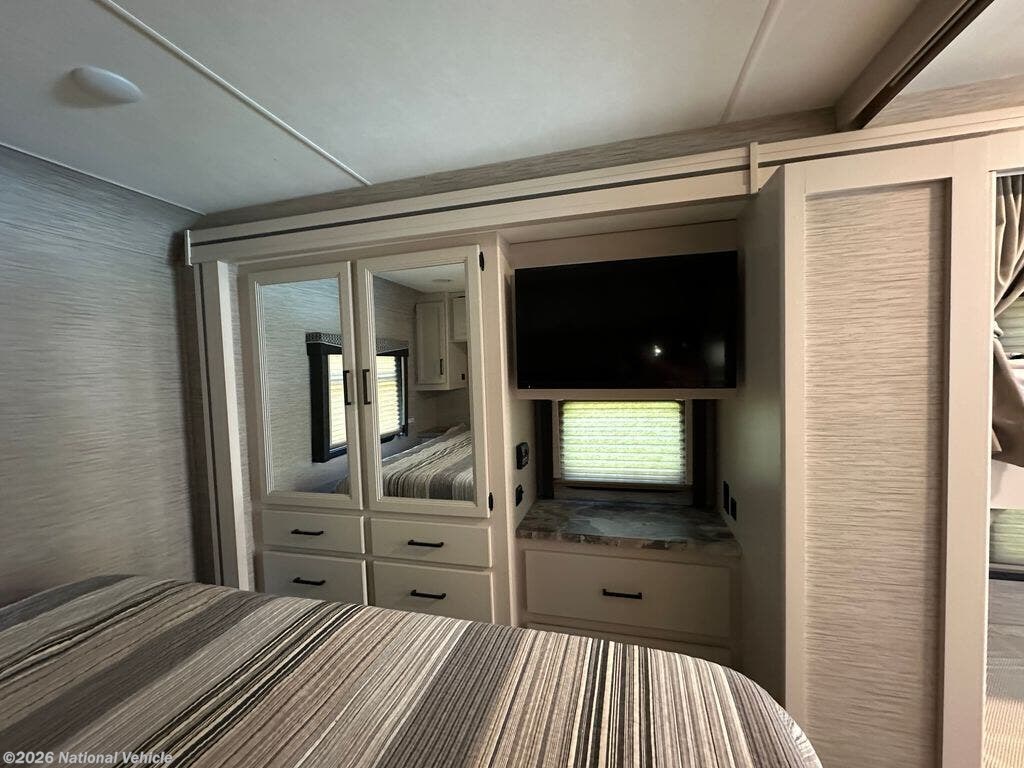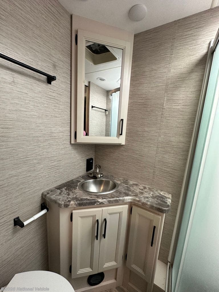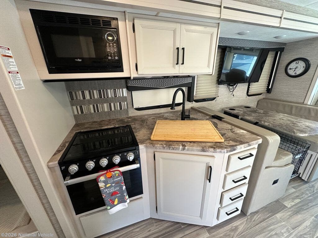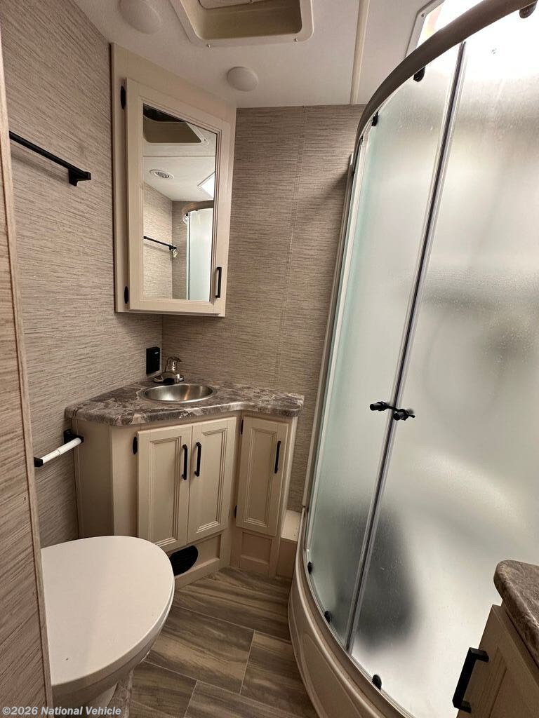 The fully equipped kitchen features a three-burner stove, microwave, mid-size refrigerator, and ample storage, making meal prep on the road simple and convenient. A centrally located full bathroom adds practicality and privacy, while multiple TVs and an entertainment system keep everyone comfortable and entertained wherever you travel.