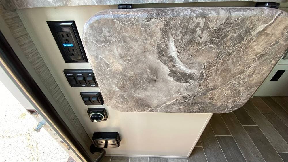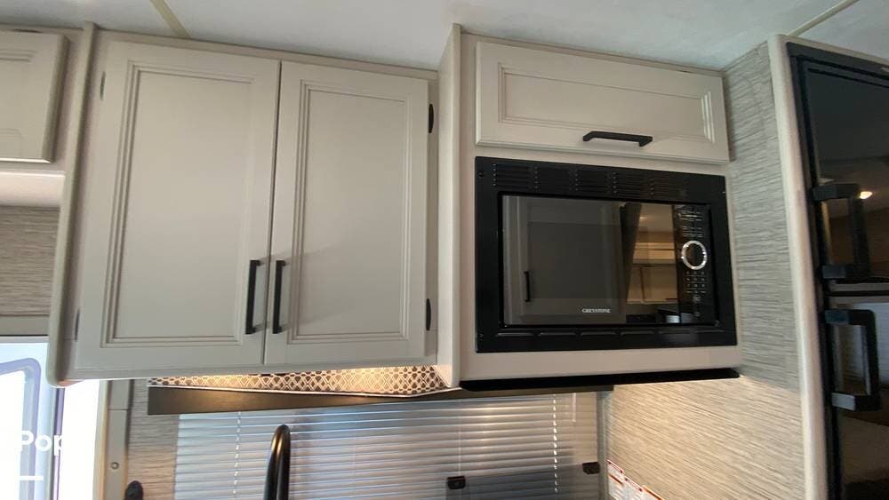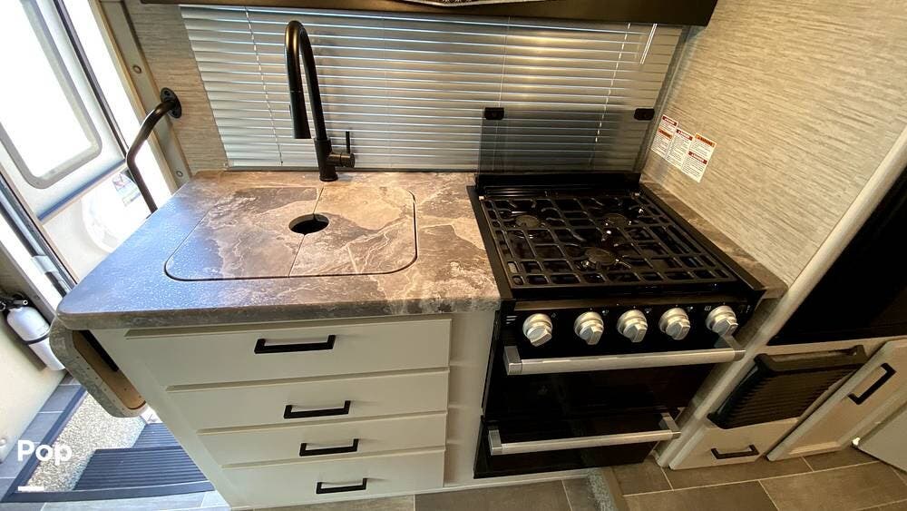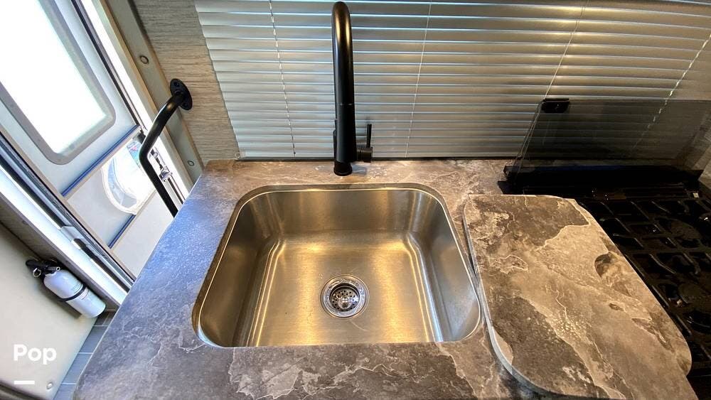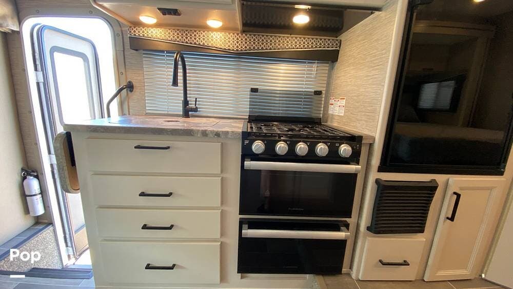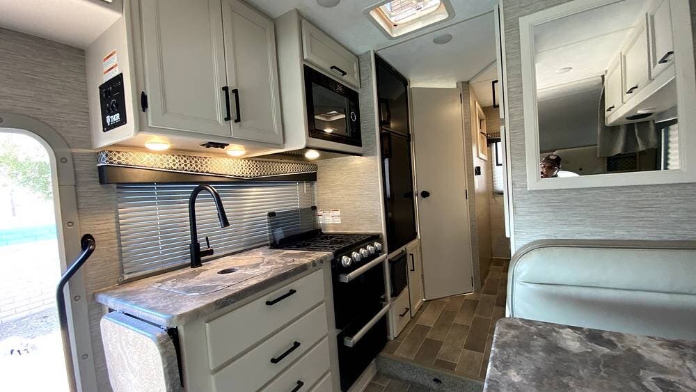 The kitchen includes essential appliances such as a refrigerator, stove, microwave, and sink for all your cooking needs. The kitchen has a collapsible countertop extension for extra storage.
