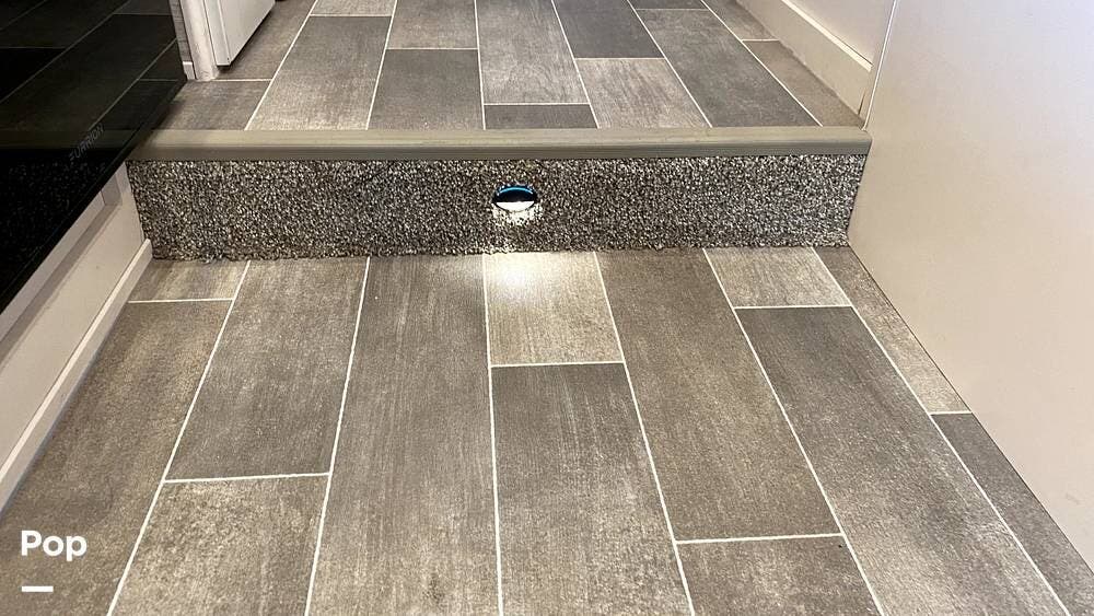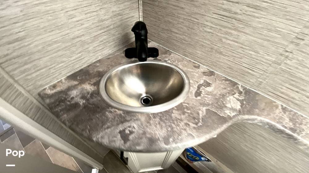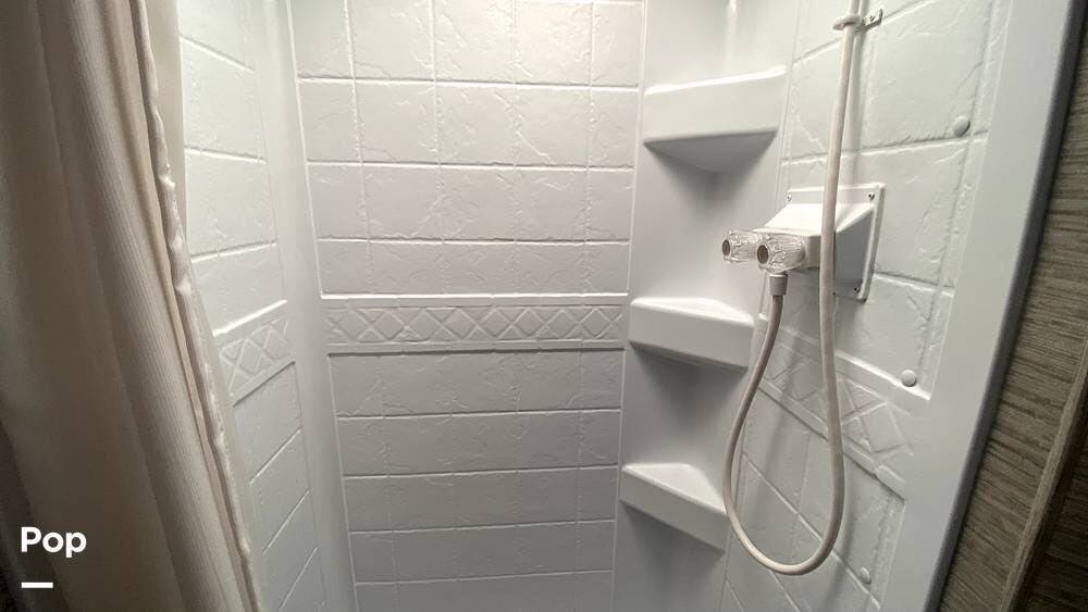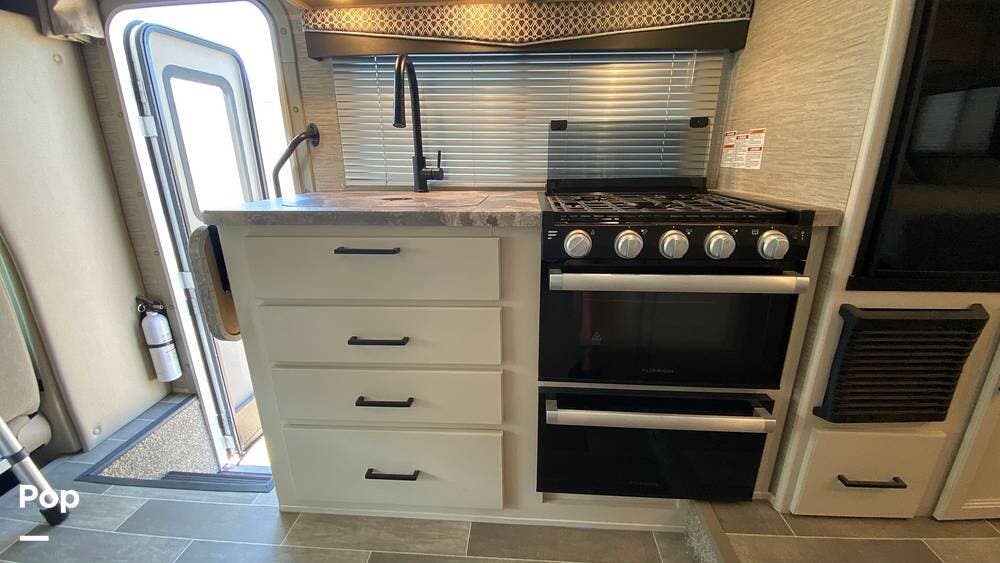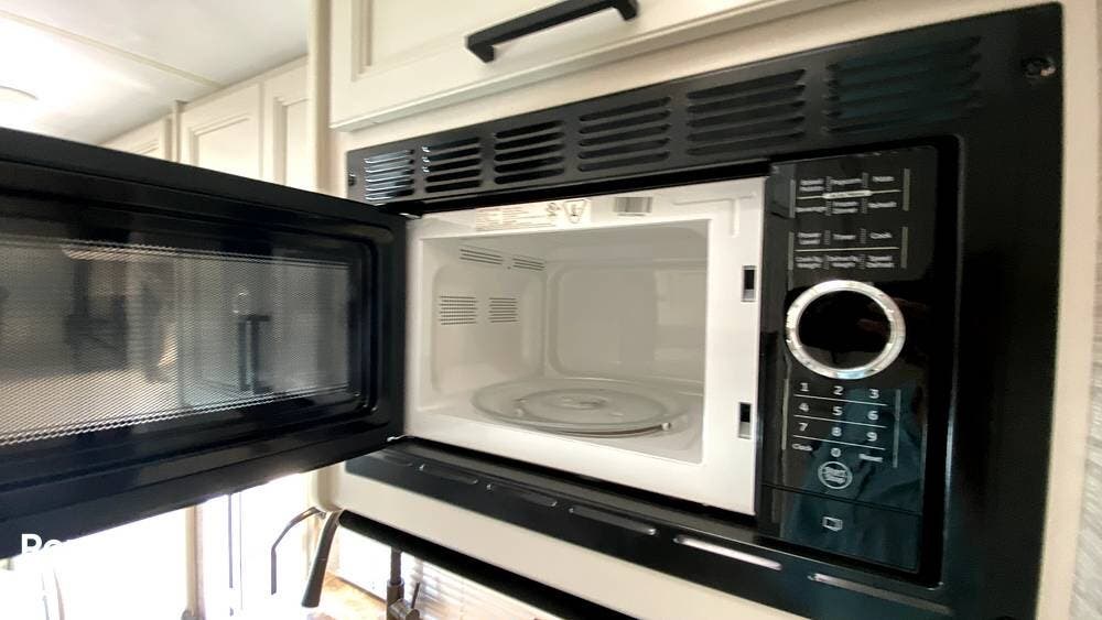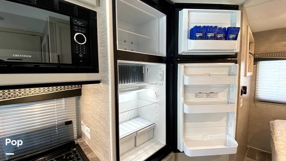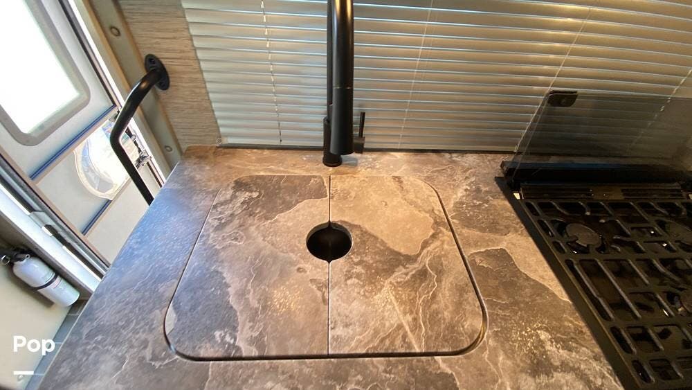 The kitchen includes essential appliances such as a refrigerator, stove, microwave, and sink for all your cooking needs. The kitchen has a collapsible countertop extension for extra storage.