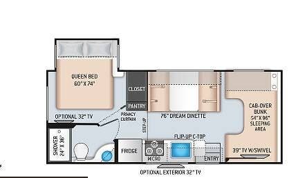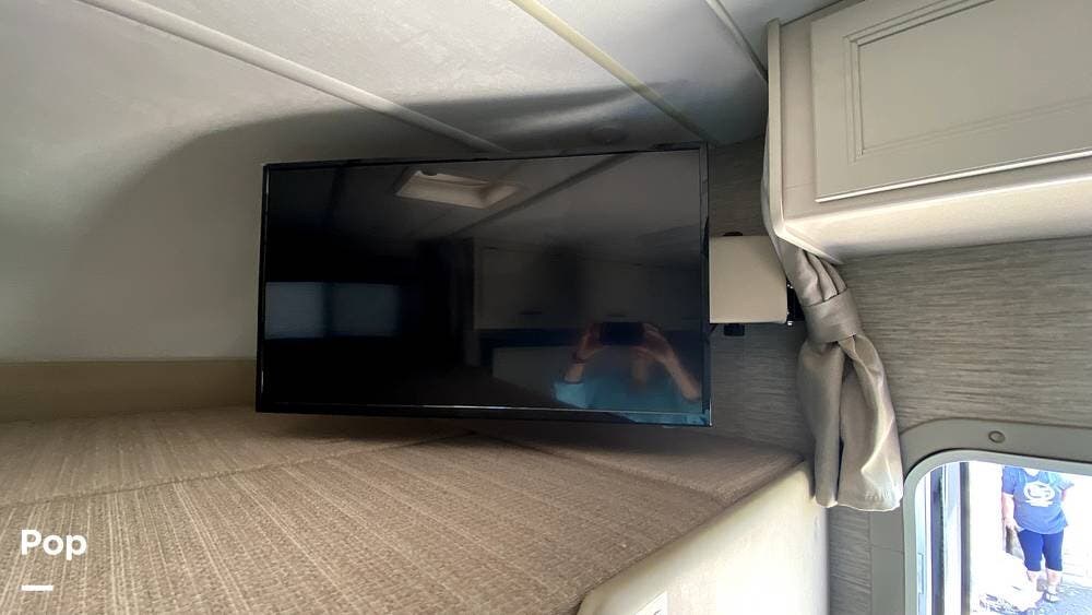 The living area is well designed with a dinette that converts into a guest's sleeping area. The second sleeping area is above the cab and accommodates two people. The big-screen TV is located above the cab area on a swivel.