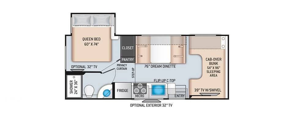 The dinette provides comfortable seating for dining and relaxing, and both can easily be converted into additional sleeping space when needed. The cab-over has a large TV extending to watch from the dinette.
