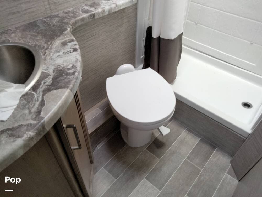The bathroom has a porcelain toilet and sink, and a roomy shower with a skylight, so you can freshen up and stay clean no matter where your travels take you. Under the sink, there is storage, and above it, there is a medicine cabinet with storage as well.