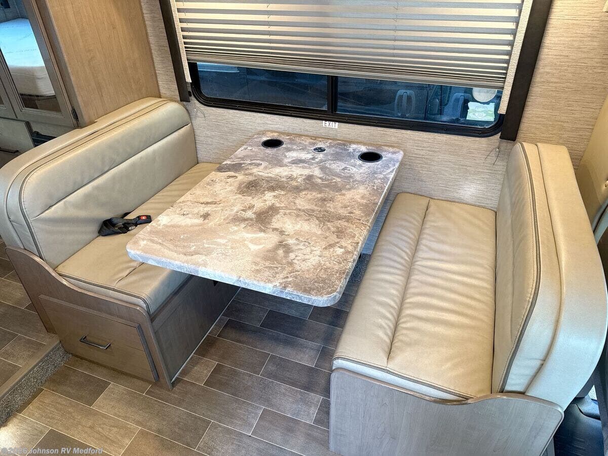 Introducing the 2022 Thor Motor Coach Chateau 22E, a versatile and well-equipped Class C RV designed to offer comfort and convenience on the road. With a reliable Ford E-Series chassis supporting a powerful 7.3L V8 gas engine that delivers 350 horsepower and 468 lb-ft of torque, this RV ensures a robust driving experience for both long journeys and short trips. **Key Features:** - **Cab Features:** - Drop down stairwell entry step for easy access - Keyless entry system complemented by an entry door deadbolt for enhanced security - Cab-over sleeping area with a telescoping ladder - Convenient 7-inch dash touchscreen with Sirius tuner - Integration with Apple CarPlay and Android Auto - Windshield privacy curtain and additional privacy screen - **Living Spaces:** - Enjoy leisure under the patio awning with LED lighting - Black framed tinted windows accompanied by privacy shades - Luxurious leatherette upholstery and LED lighting for a comfortable atmosphere - **Dining Area:** - Elegant high sheen cabinetry and stylish leatherette Dream Dinette - Modern 12v switched galley ceiling fan and galley accent lighting - Durable pressed laminate countertops with single bowl stainless steel sink and a faucet pull-down sprayer - Fully equipped kitchen with a refrigerator, glass cooktop cover, matching metal pan drawer, range hood task light, and a microwave oven - **Entertainment & Electronics:** - Advanced entertainment system for quality leisure - Winegard ConnecT 2.0 with WiFi and 4G TV antenna - Smart TV for an enhanced viewing experience - **Sleeping Accommodations:** - Configurable sleeping spaces based on the specific floorplan - Bedroom outfitted with USB ports and a 12v CPAP outlet for convenience - **Bathroom:** - Features a shower skylight and a curved shower curtain - Foot flush toilet and switched power bath vent for practicality - **Mechanical Features:** - Ready for solar power integration - Equipped with a 4.0 Onan RV QG 4000 gas generator with automatic generator start and auto transfer switch - 30-Amp service cord, ceiling ducted AC, and patio side outdoor spray port for complete comfort - **Construction & Build:** - Sturdy welded steel floor and tubular aluminum cage - High-quality Vacu-Bond laminate construction with block foam insulation - Slick fiberglass exterior, premium crossflex roofing, and a roof ladder for upkeep - Flush storage doors and lighted rotocast bins to keep your essentials organized The Thor Chateau 22E 2022 model is designed with travelers in mind, providing all the necessary features to ensure a comfortable and enjoyable journey. Whether you're embarking on a weekend getaway or an extended adventure, this RV has everything you need to make the road your home. ???