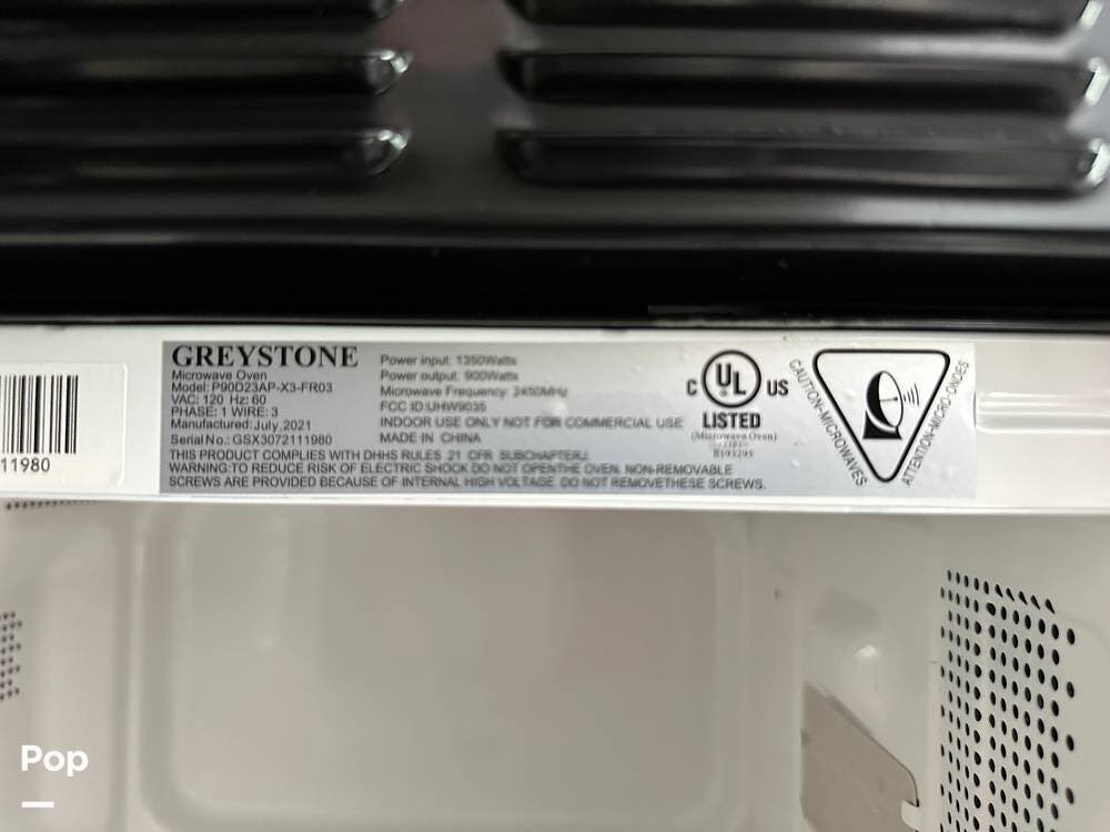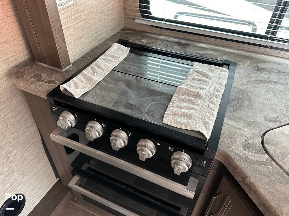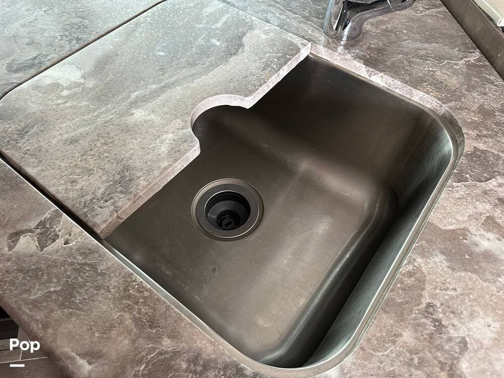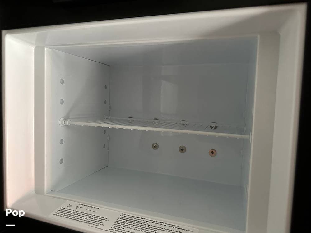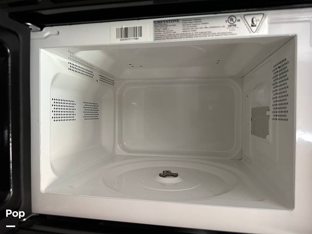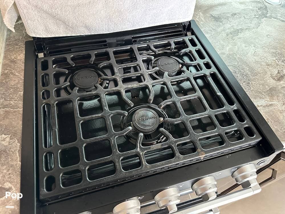 To the left of the entry door, you'll find a long kitchen counter with solid-surface countertops, a large TV, a double sink, a three-burner range, a microwave, and a refrigerator/freezer.