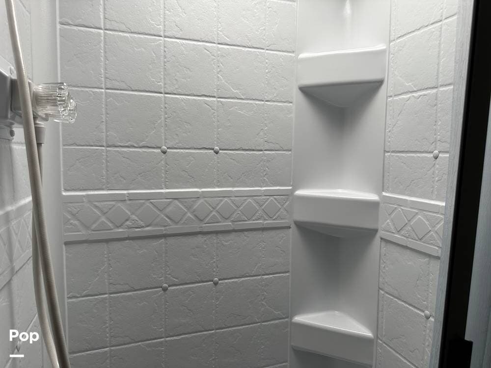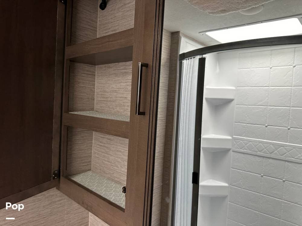 The coach has a spacious mid-bath with plenty of cabinets, a sink, a toilet, and a tall shower. The queen suite has dual wardrobes, a TV, and a privacy door.