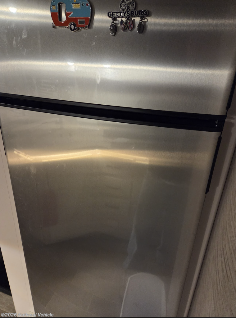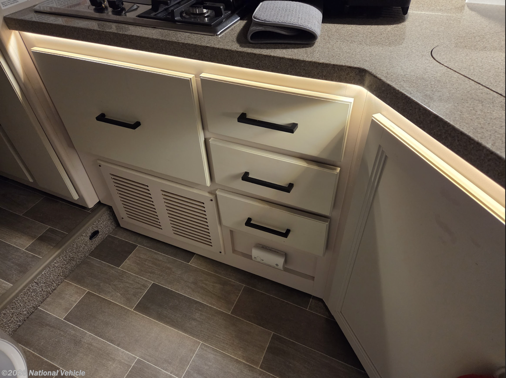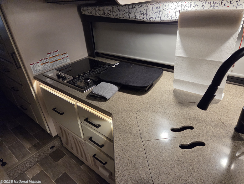 The gourmet kitchen is modern and efficient, featuring a 2-burner cooktop, induction cooktop, and convection microwave, giving you flexible cooking options wherever the road takes you.