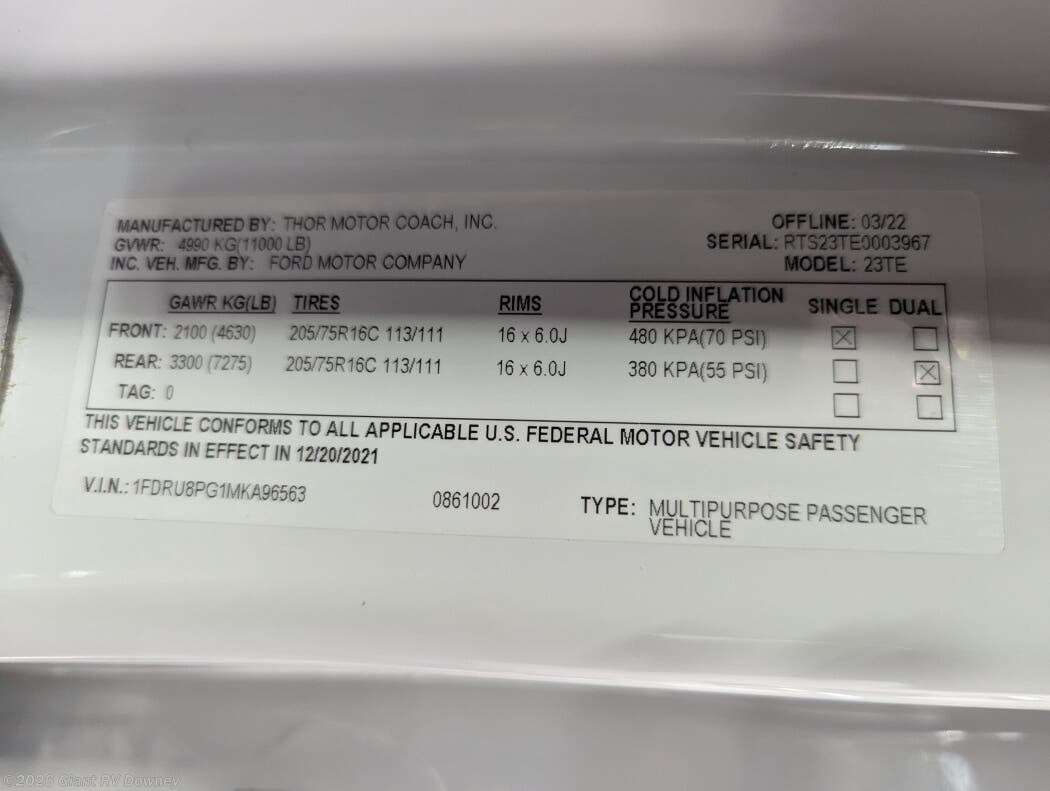 Request More Info on this 2022 Thor Motor Coach Compass RUV 23TE Offered for sale by Giant RV