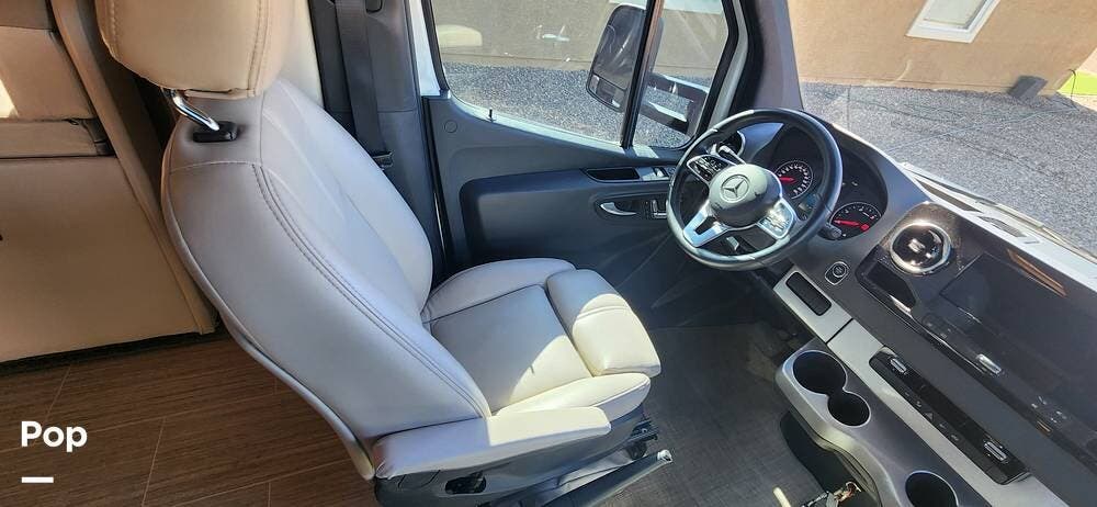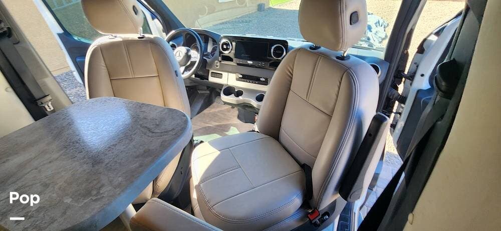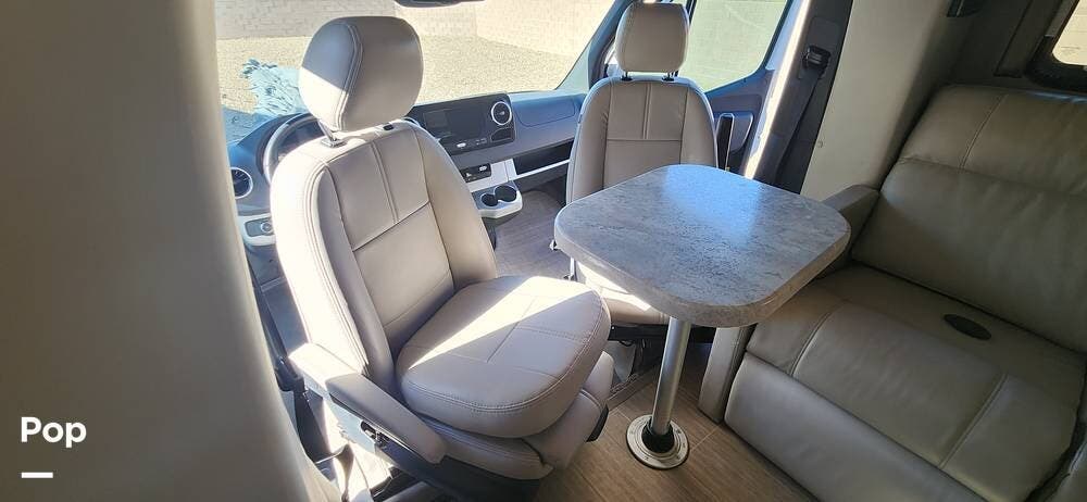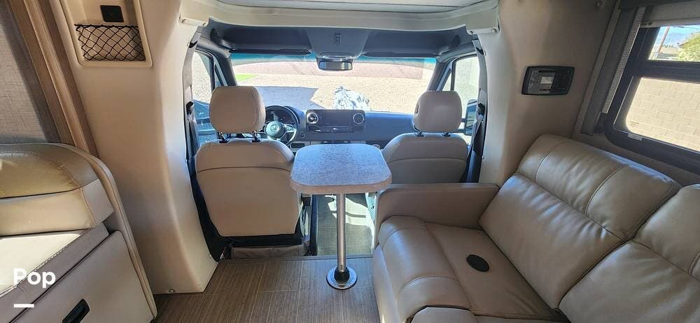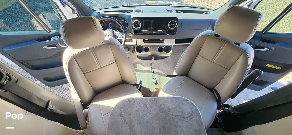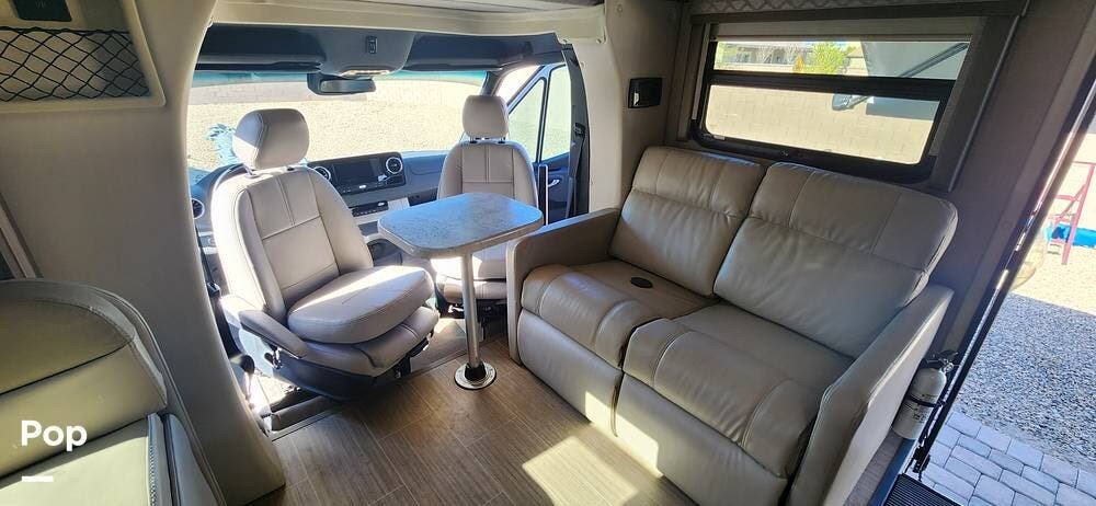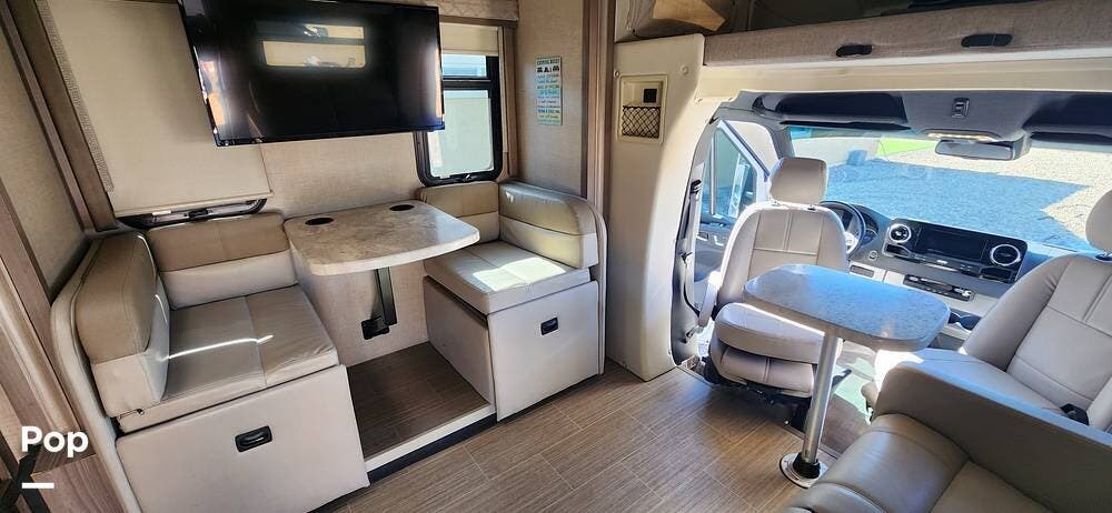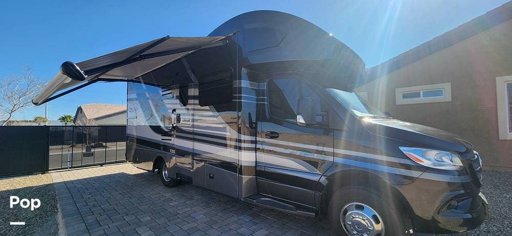 Electrical service is 30-amp with an LP generator, house batteries, and LED lighting. Standard features include driver-assist systems from Mercedes-Benz, a backup camera, a power awning, an electric entry step, and lighted exterior storage compartments.