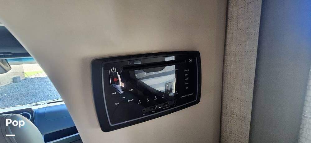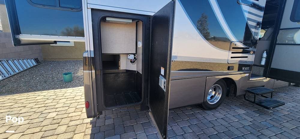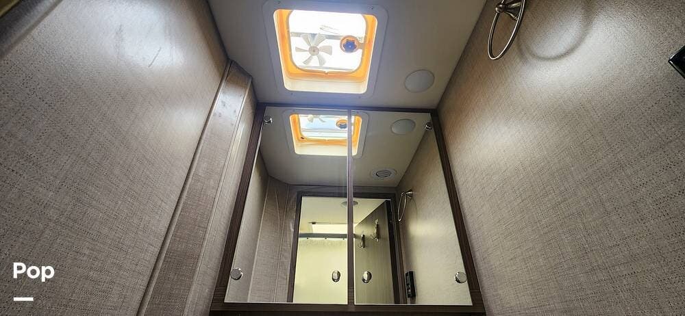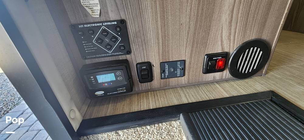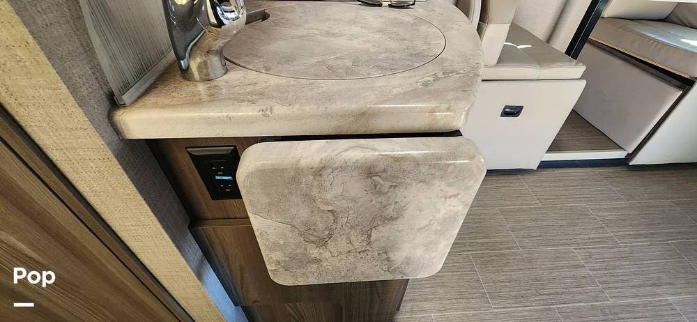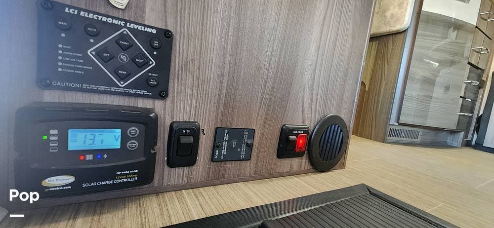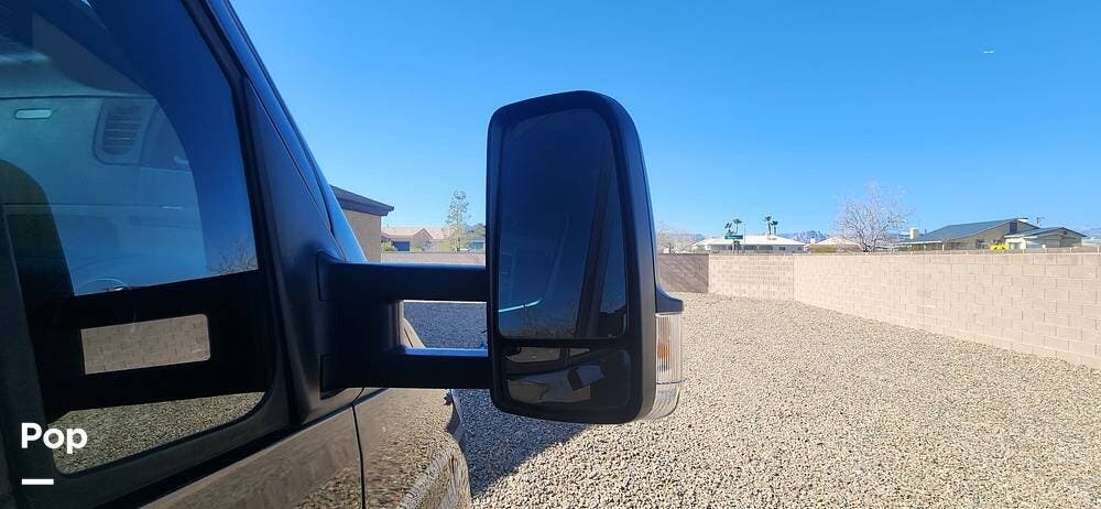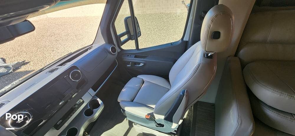 Electrical service is 30-amp with an LP generator, house batteries, and LED lighting. Standard features include driver-assist systems from Mercedes-Benz, a backup camera, a power awning, an electric entry step, and lighted exterior storage compartments.