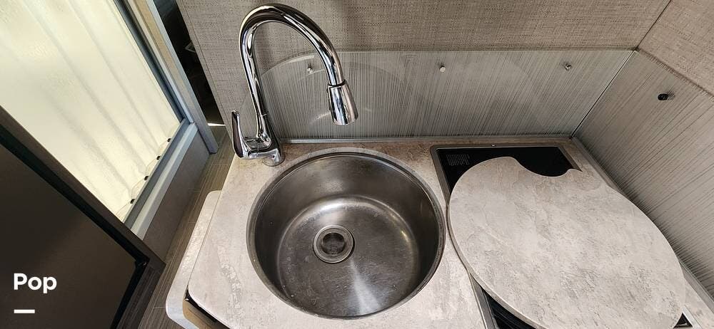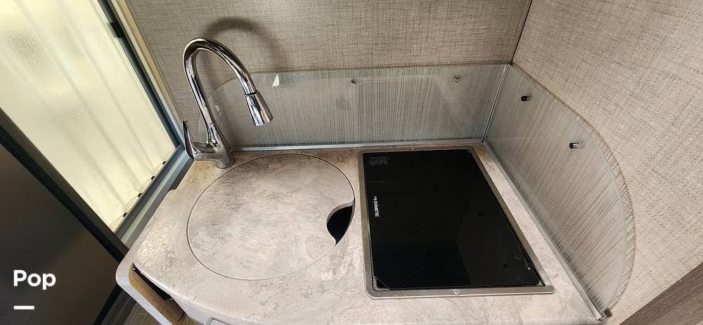 The kitchen is equipped with a two-burner cooktop, a convection microwave, a 12V refrigerator, a sink, and storage cabinets.