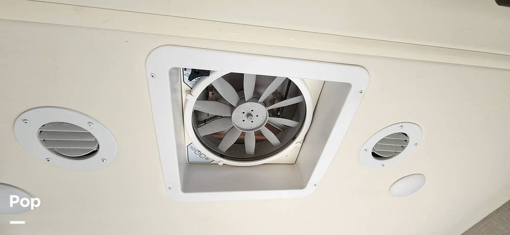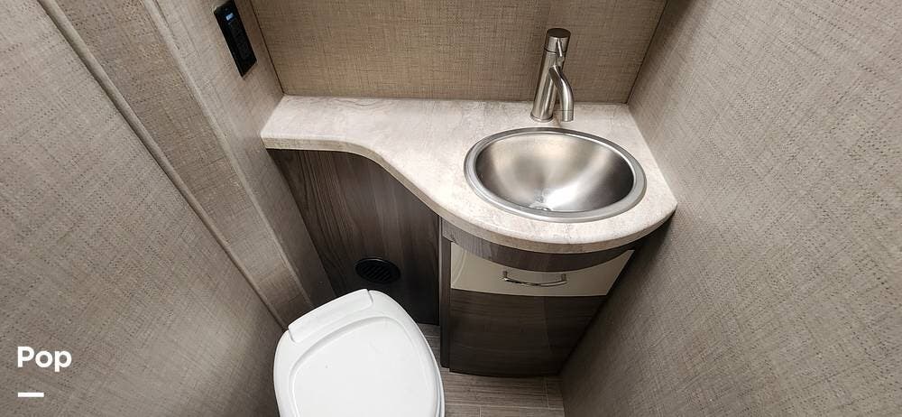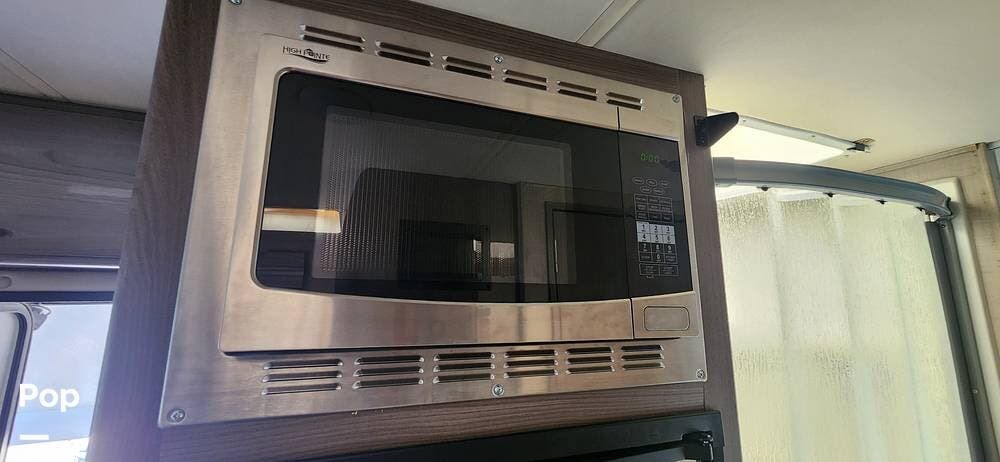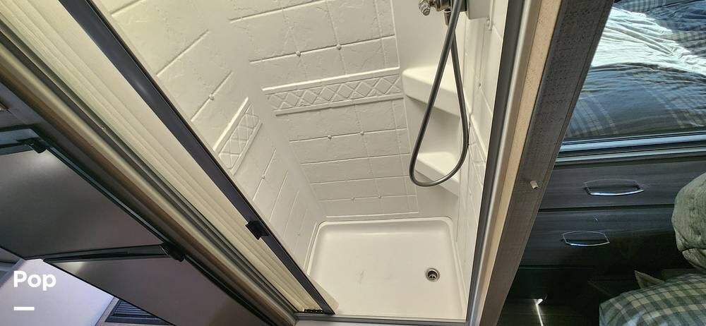 Kitchen & Bath: Equipped with a 12V refrigerator, two-burner gas cooktop, convection microwave, and a split bathroom with a 24" x 32" shower.