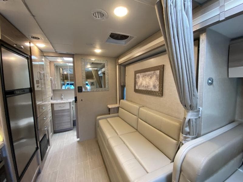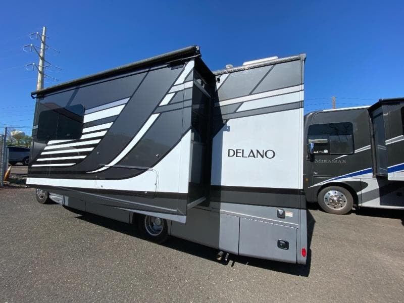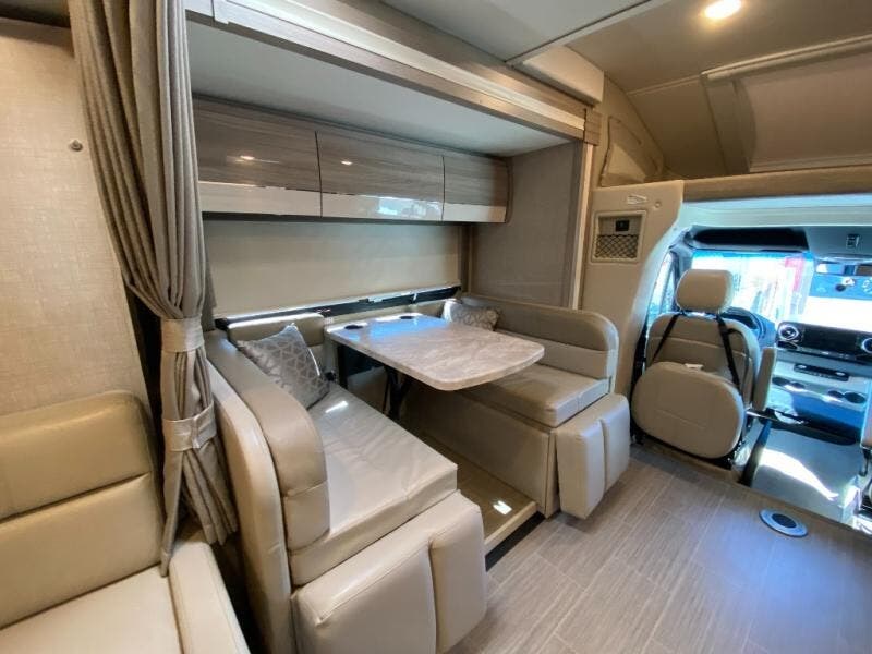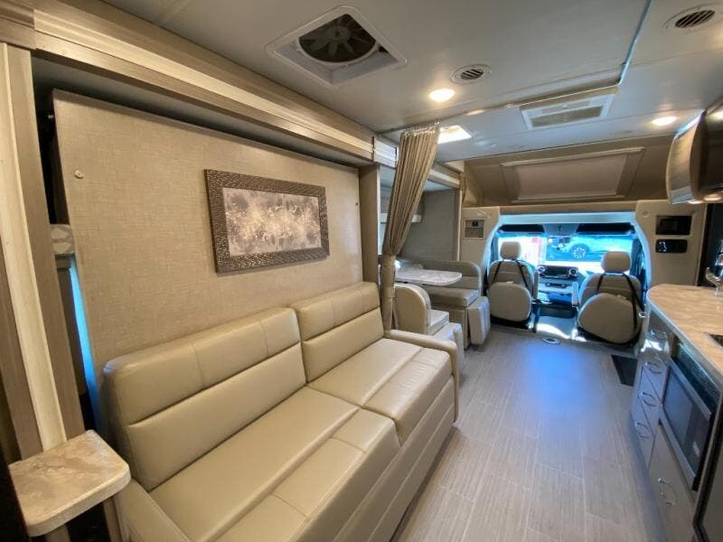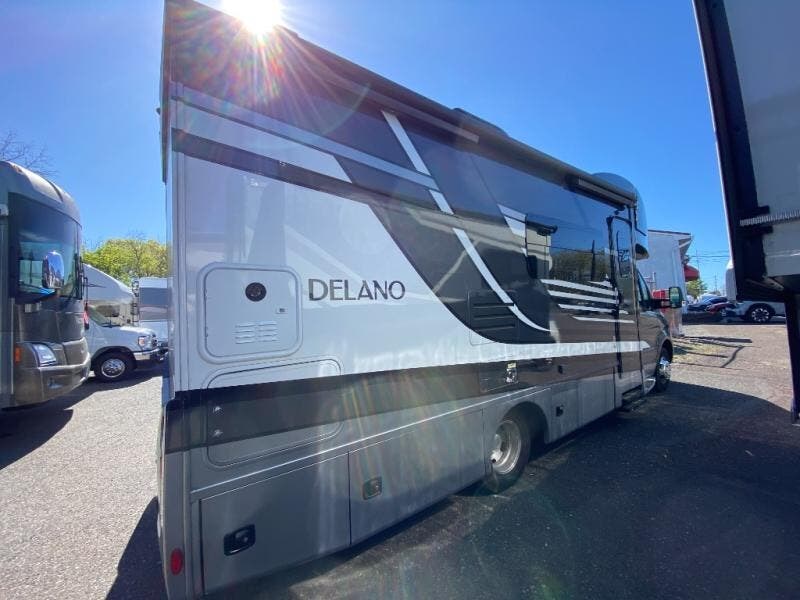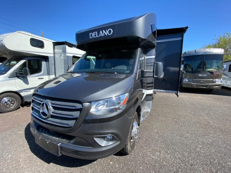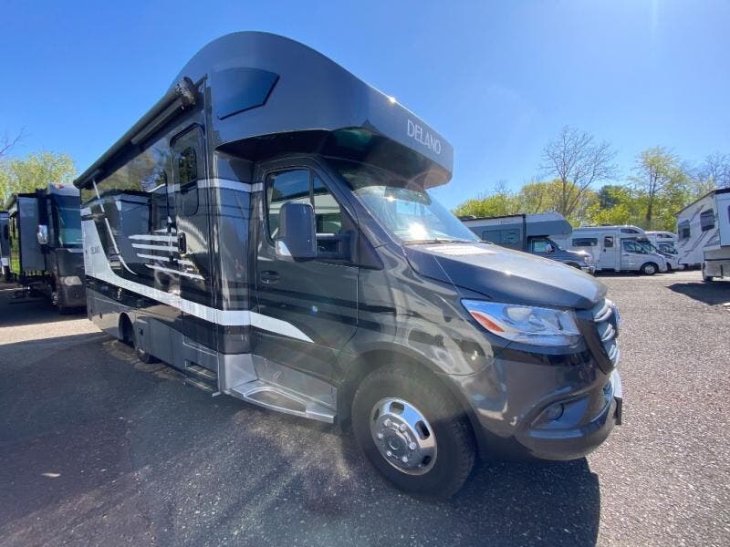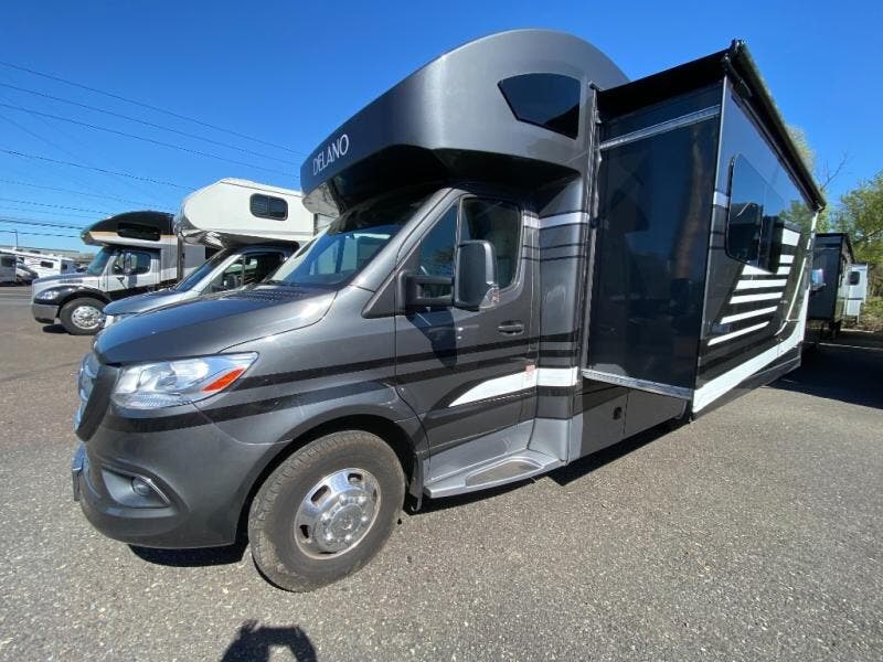Luxury comes standard in the Delano Sprinter Class C diesel motorhomes by Thor Motor Coach. You will find it so easy to maneuver the road with the Mercedes-Benz Safety Package that includes features such as active braking assist and distance regulator distronic plus that will help keep a safe distance from vehicles in front of you. The frameless windows and the full-body paint package with gel coated sidewalls is sure to be eye-catching, plus there is invisible front paint protection for added defense against the elements. Each model includes the Rapid Camp+ multiplex wiring control system that will make set-up easier than ever, a Winegard ConnecT 2.0 WiFi/4G/TV antenna to keep you connected to the outside world, and a whole coach water filtration system for fresh H2O day or night. The Delano Sprinter also includes many interior comforts, like the easy-to-clean residential vinyl flooring, the high-gloss Euro-style cabinetry, and the Leatherette furniture!