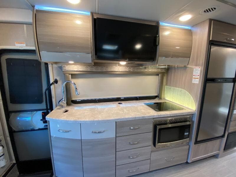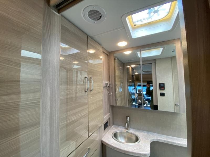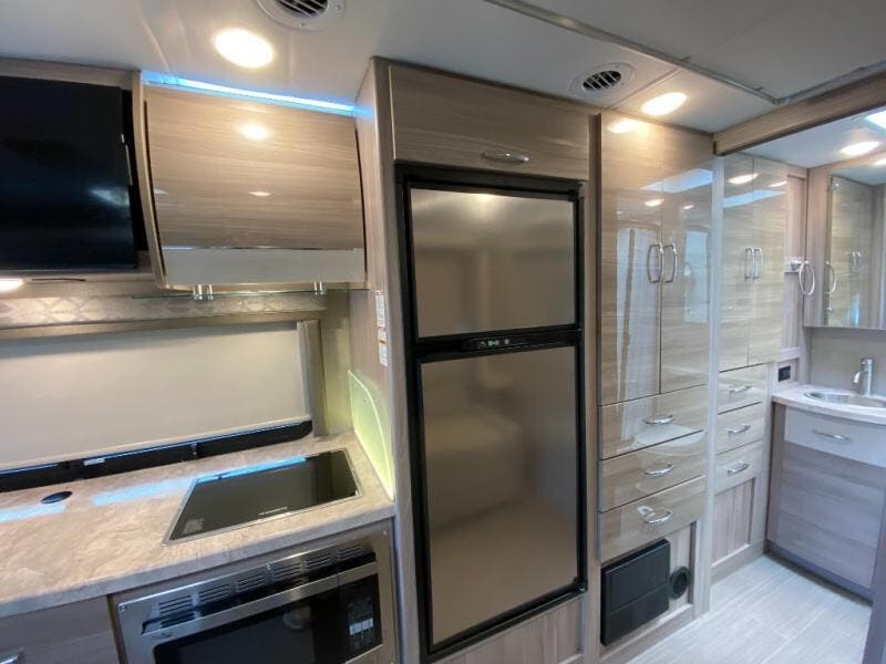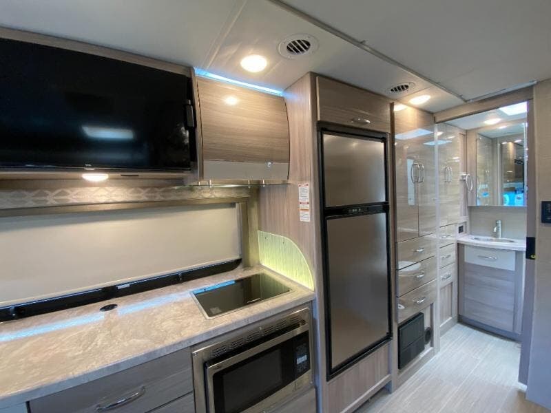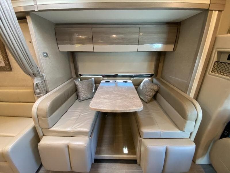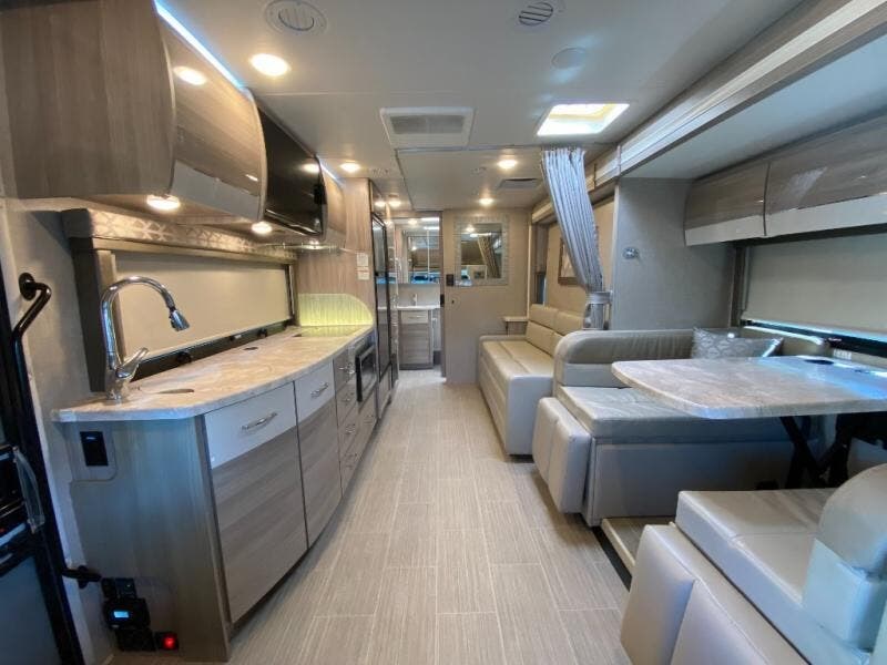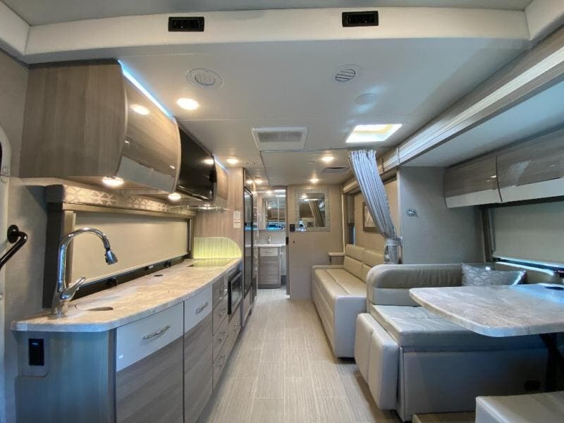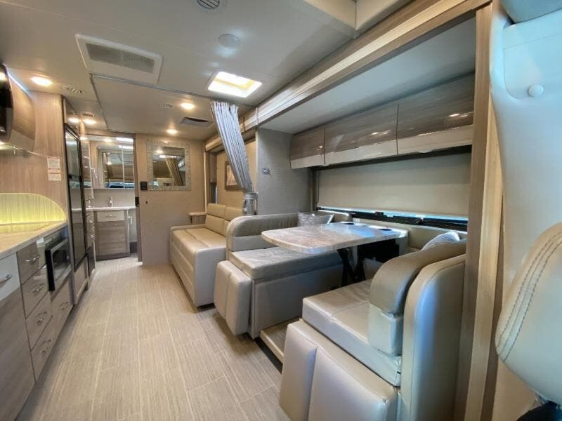 Luxury comes standard in the Delano Sprinter Class C diesel motorhomes by Thor Motor Coach. You will find it so easy to maneuver the road with the Mercedes-Benz Safety Package that includes features such as active braking assist and distance regulator distronic plus that will help keep a safe distance from vehicles in front of you. The frameless windows and the full-body paint package with gel coated sidewalls is sure to be eye-catching, plus there is invisible front paint protection for added defense against the elements. Each model includes the Rapid Camp+ multiplex wiring control system that will make set-up easier than ever, a Winegard ConnecT 2.0 WiFi/4G/TV antenna to keep you connected to the outside world, and a whole coach water filtration system for fresh H2O day or night. The Delano Sprinter also includes many interior comforts, like the easy-to-clean residential vinyl flooring, the high-gloss Euro-style cabinetry, and the Leatherette furniture!