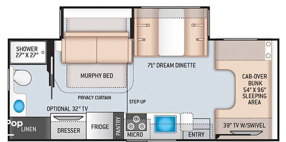 Inside, it features a full kitchen, a Dream dinette, a double over-cab bed, and a Murphy bed hidden behind the rear lounger. A full bathroom is to the rear.