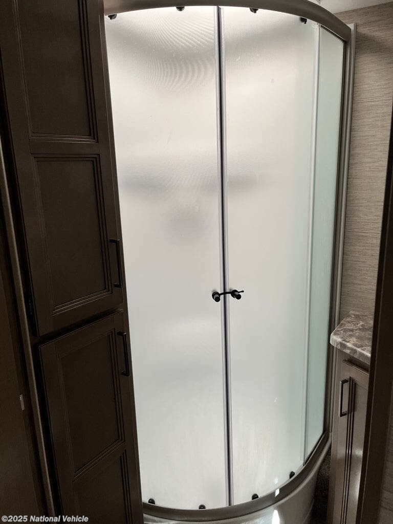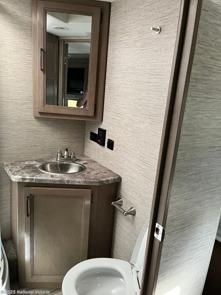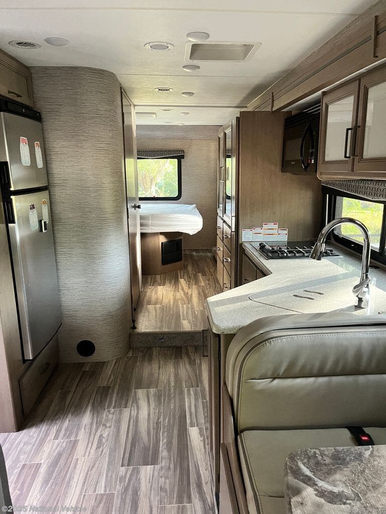 The well-appointed kitchen includes a three-burner cooktop, refrigerator, and plenty of storage, making meal prep effortless while on the road. Entertainment is easy with a TV and sound system, and the cab-over bunk adds extra sleeping space for kids or guests. A slide-out expands the living space, creating an open and inviting interior for dining, lounging, or socializing.