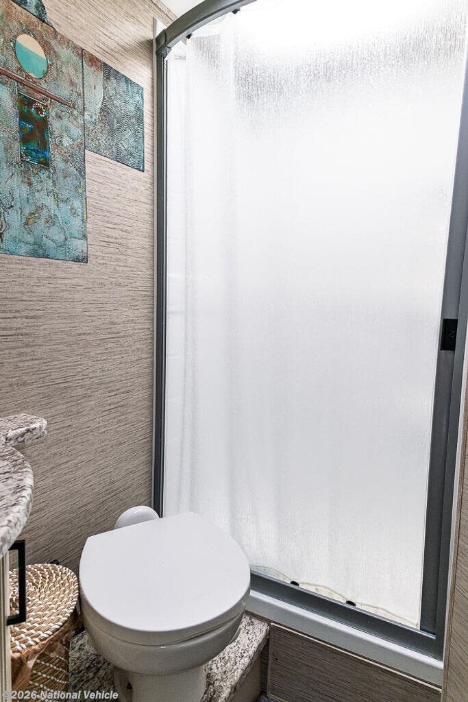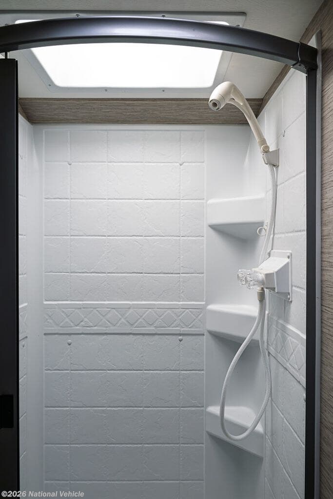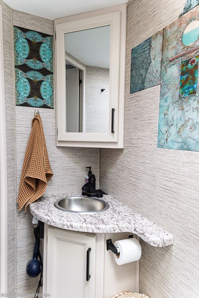In the rear left corner is the bathroom. Here you will find a sink with a medicine cabinet, toilet, and a shower.