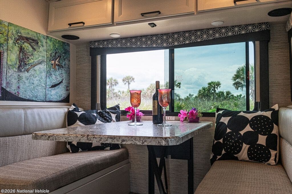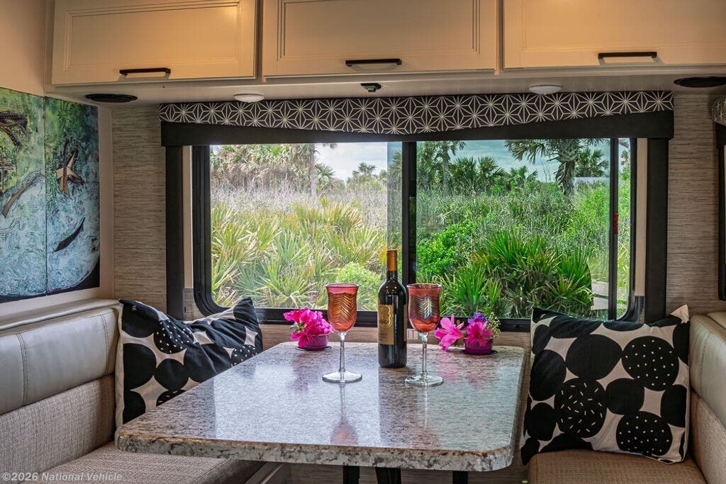 Above the cab, there is a bunk area plus there is a TV with a swivel arm which makes it easy to watch TV from just about any location in the front of this model. Enjoy your meals at the Dream Dinette and at night you can easily convert this area into additional sleeping space.