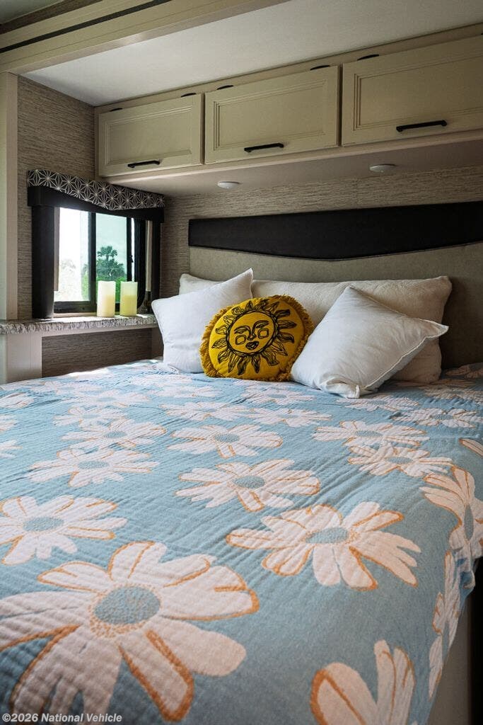 The opposite corner from the bathroom features the bedroom area with a privacy curtain. Here you will also find a queen bed with overhead cabinets!