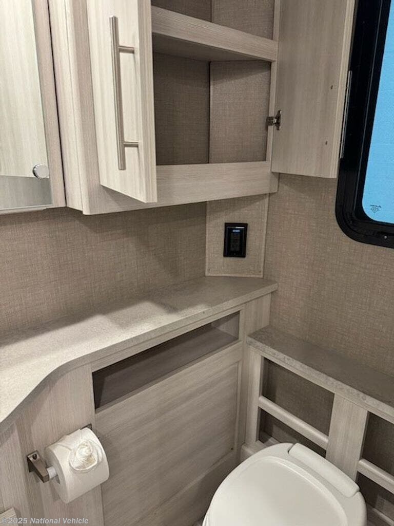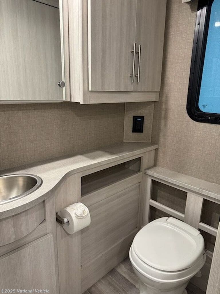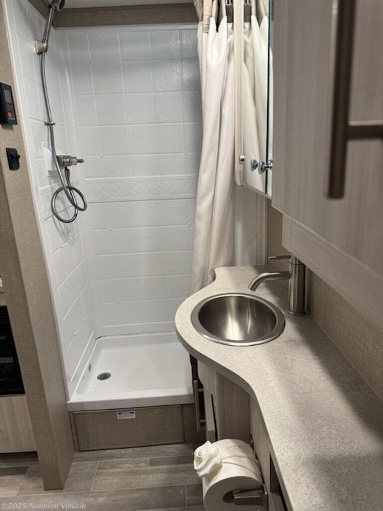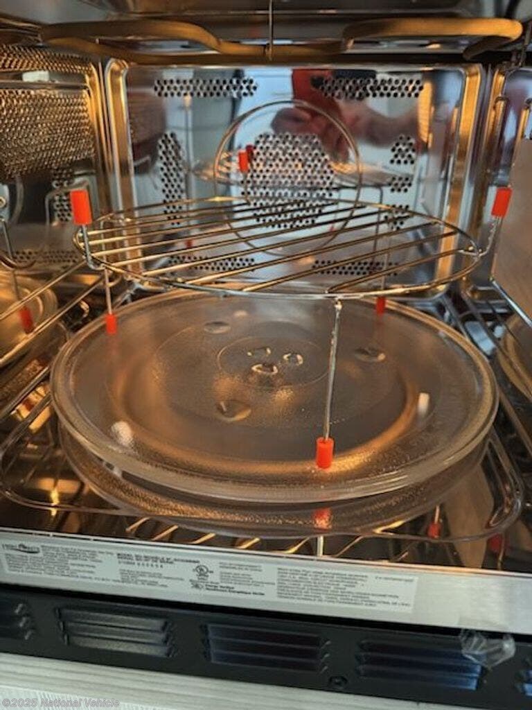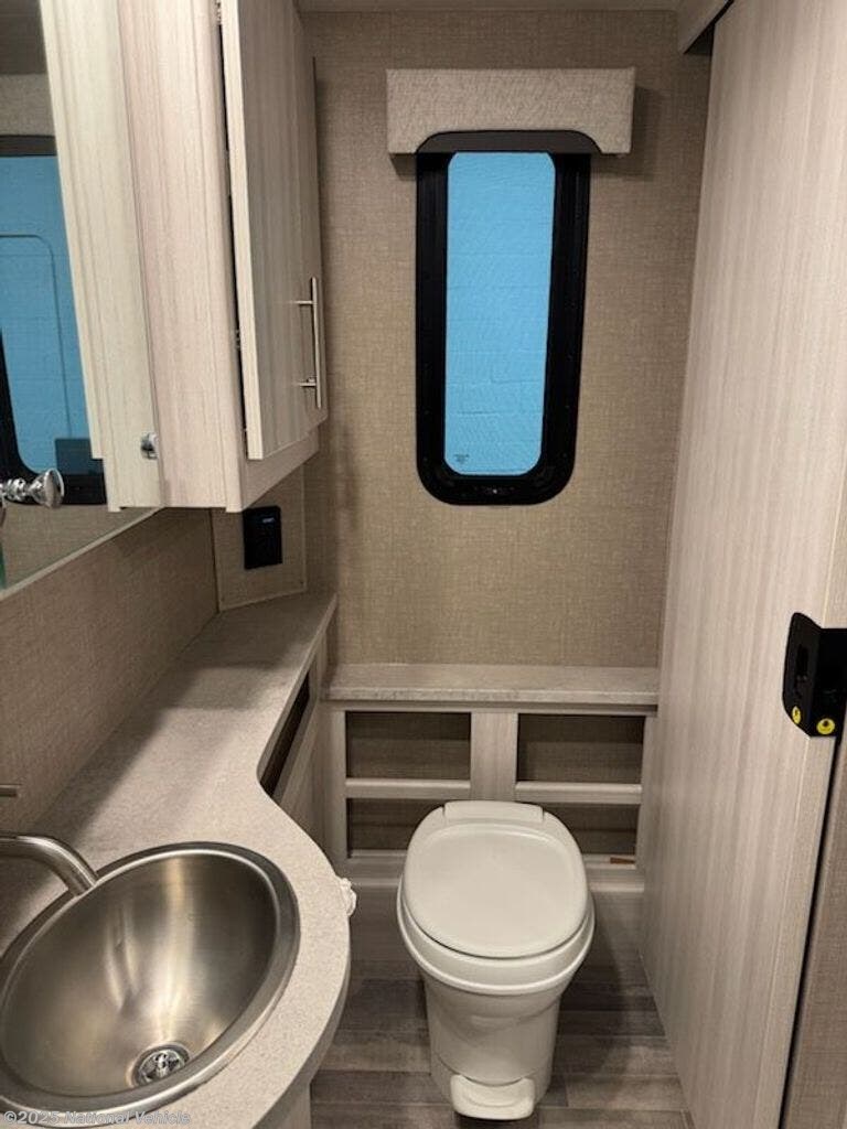 The fully equipped kitchen features a two-burner gas cooktop, convection microwave, stainless-steel sink, and refrigerator, allowing you to prepare meals with ease on the go. The full bathroom includes a shower, toilet, vanity, and storage, offering complete residential-style convenience in a compact footprint.