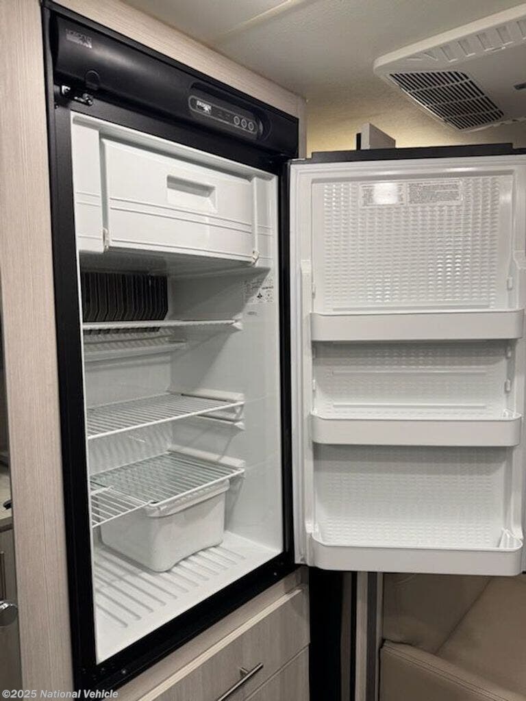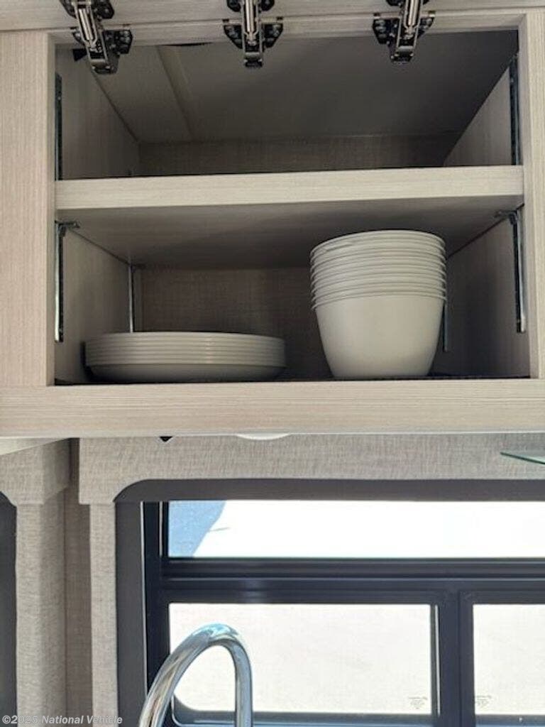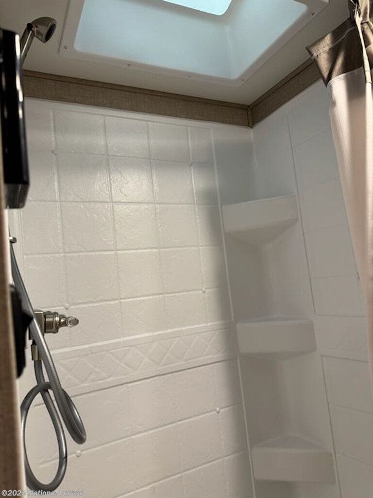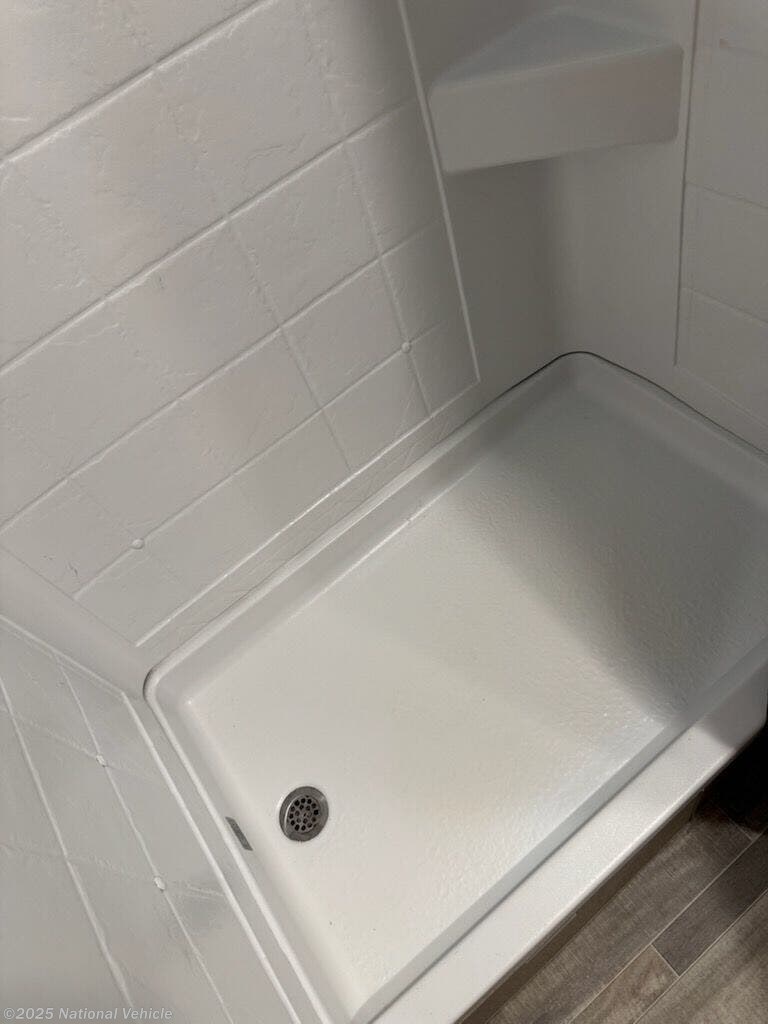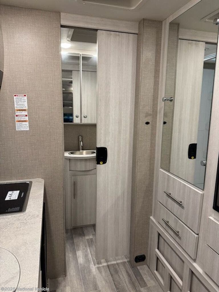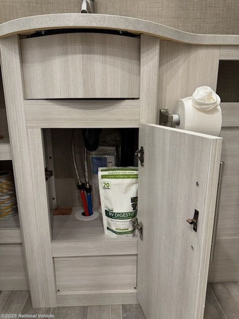 The fully equipped kitchen features a two-burner gas cooktop, convection microwave, stainless-steel sink, and refrigerator, allowing you to prepare meals with ease on the go. The full bathroom includes a shower, toilet, vanity, and storage, offering complete residential-style convenience in a compact footprint.